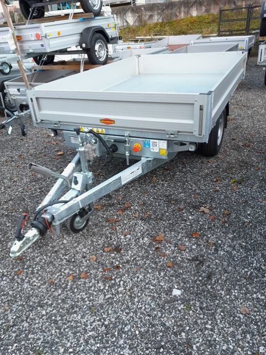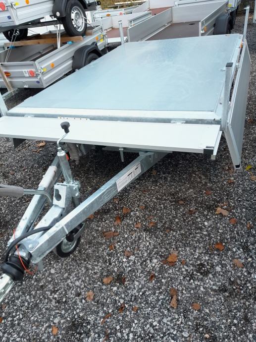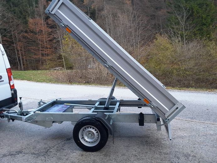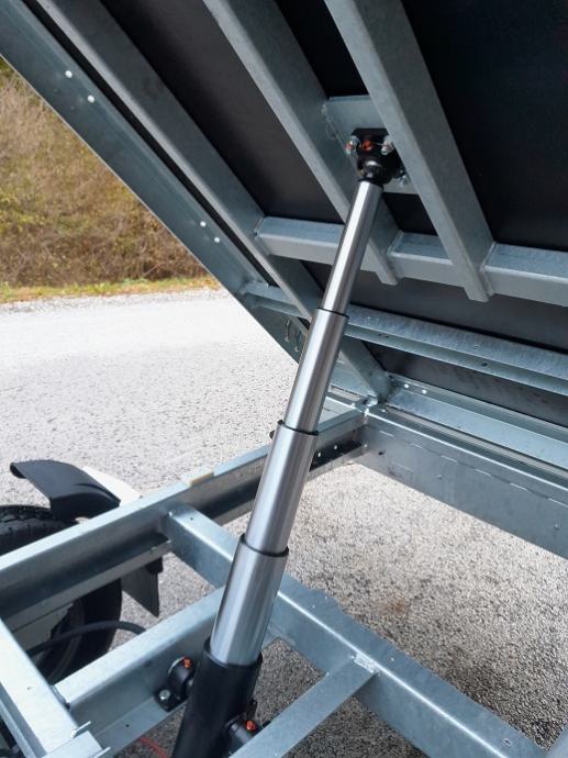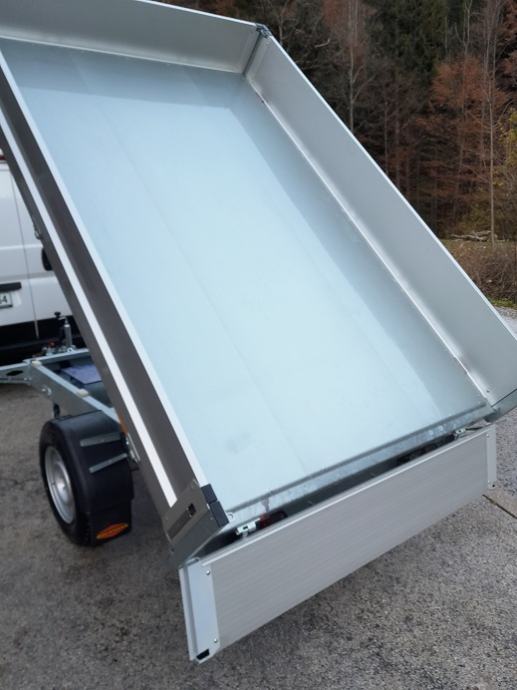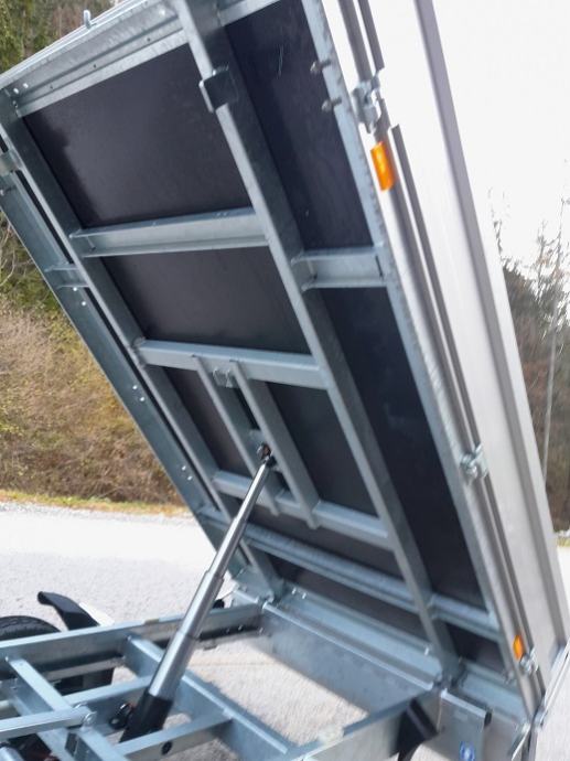 Ravno tako je močno ogrodje za nadgradnjo, na kateri je vodoodporna vezana plošča,na tej plošči je še jeklena pločevina za lažji zdrs tovora pri kipanju. Ker je pod pločevino vezana plošča, se ta ne krivi.Na podu ima tudi 4 x pritrdilo z vzmetmi, da vam med vožnjo ne rožlja.
