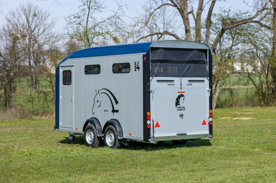 U ponudi je Cheval Liberté Maxi 4, najprostraniji model iz serije dijagonalnih prikolica, namijenjen za prijevoz do četiri konja. Ovaj model donosi izvanrednu kombinaciju udobnosti, sigurnosti i organizacije, posebno prilagođenu za natjecateljske i profesionalne korisnike.