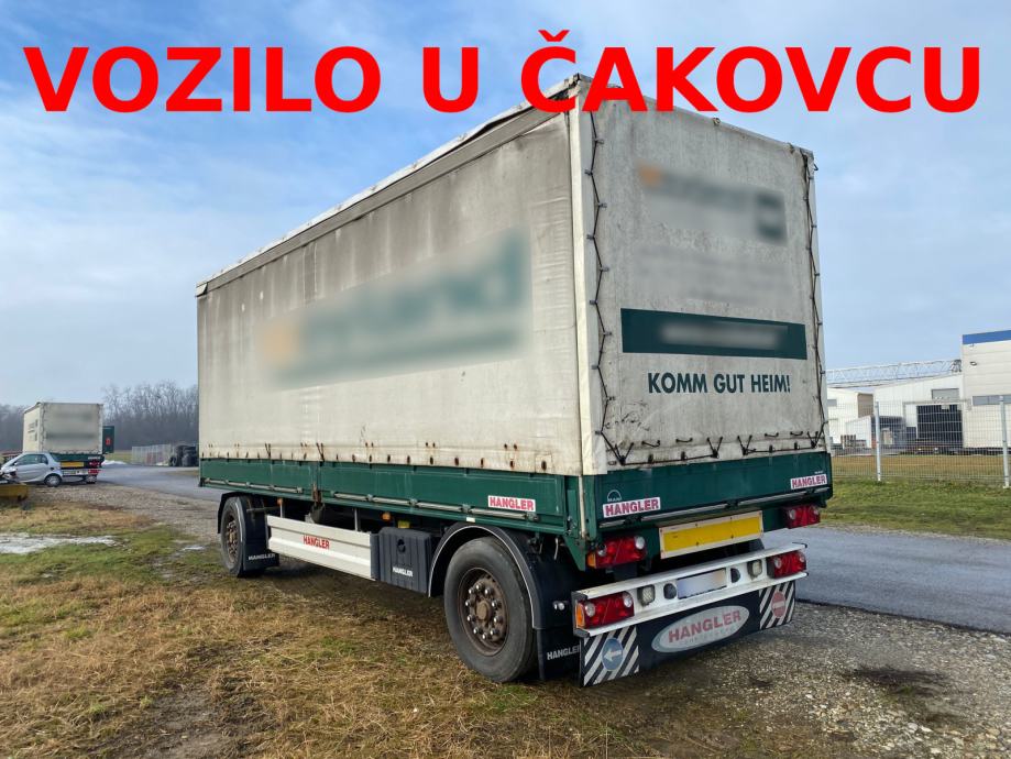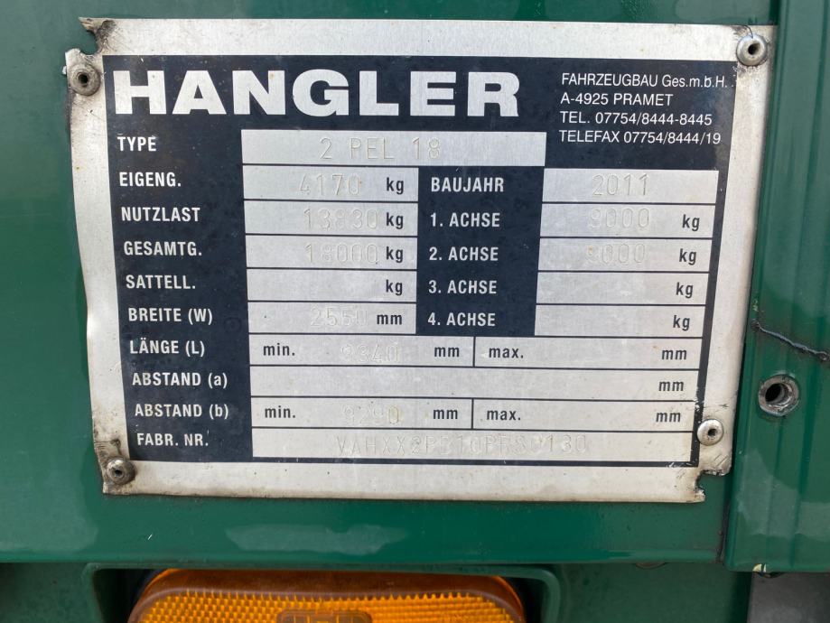 HANGLER 2 PEL 18, 2-osovinska tandem prikolica, u prometu od 01/2011, visoko kopčanje, ABS, EBS, zračni ovjes, BPW Eco plus osovine, disk kočnice, Airtube sistem, aluminijske bočne stranice, klizna cerada, kutija za alat, sanduk dužine 6.200 mm, NDM: 18.000 kg, masa praznog vozila: 4.170 kg, nosivost: 13.830 kg, gume 385/55 R22,5, VIN: VAHXX2PB10PRS0130