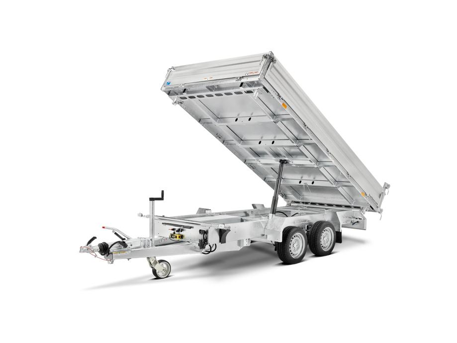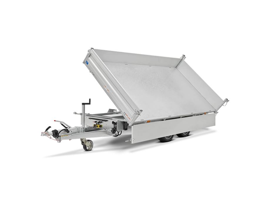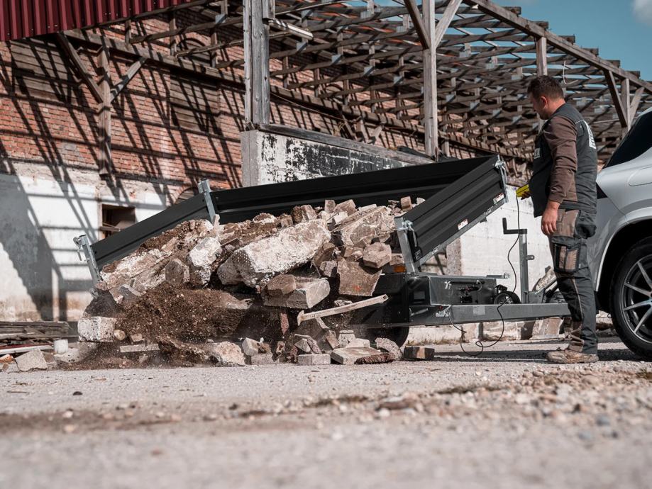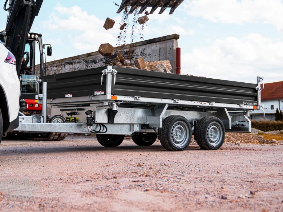 Robusna i izdržljiva prikolica s trostranim kipanjem, pogodna za razne namjene, uključujući i prijevoz radnih strojeva.