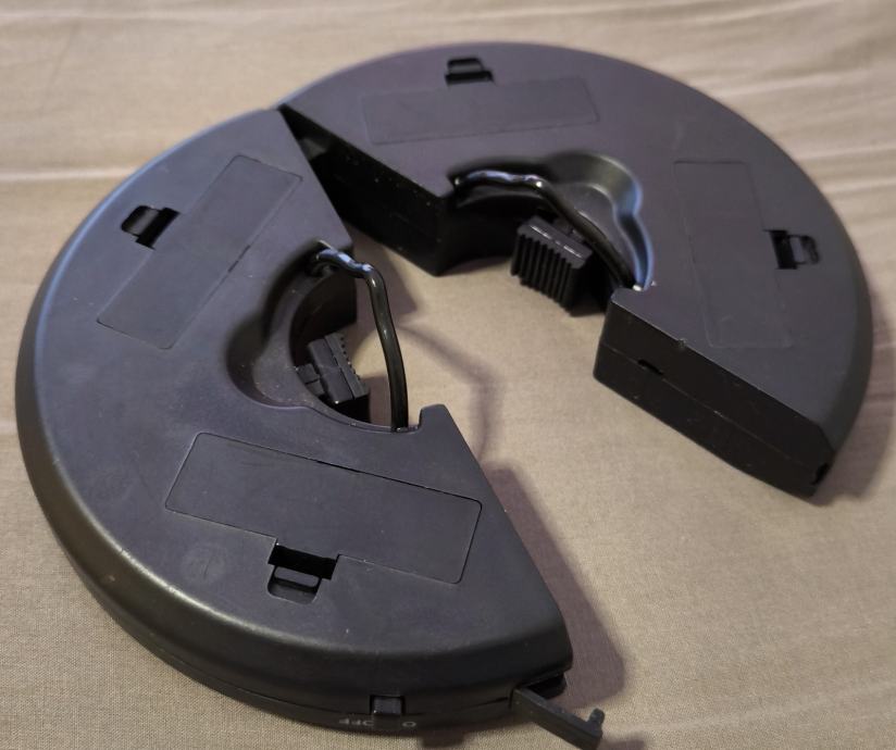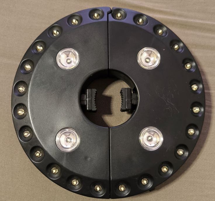Prodajem bežičnu LED svjetiljku za suncobran, crne boje. Radi se o okruglom, dvorednom prstenu s LED diodama koji se montira direktno na stup suncobrana – dizajnirana je u dvije polovice koje se spajaju oko stupa i pričvršćuju mehanizmom u sredini. Uz rubove se nalaze sitnije LED diode, a u gornjem dijelu i nekoliko većih, jačih svjetala. Napaja se na baterije.