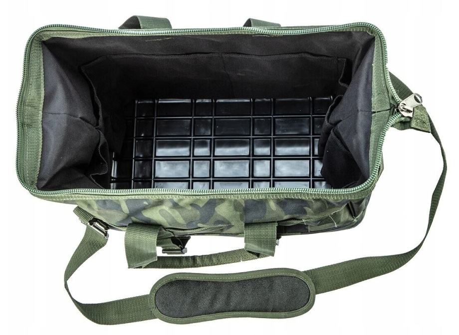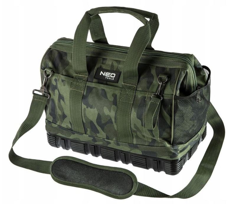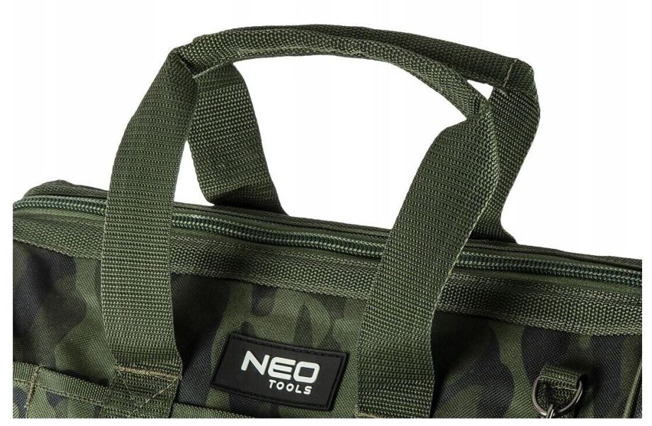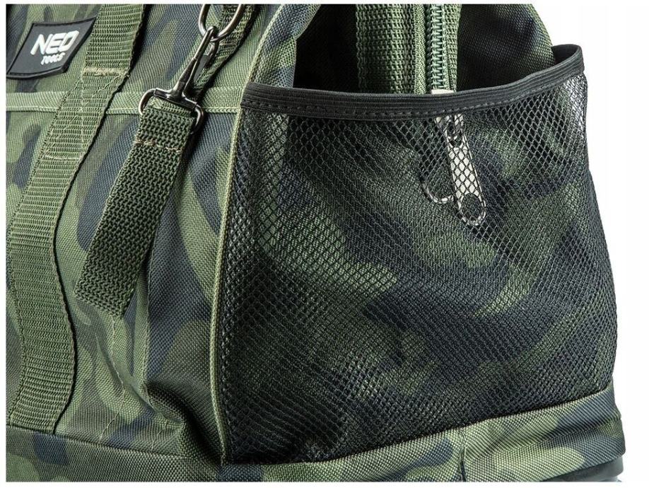 Camo torba 40x22x33 cm NEO (84-332) izrađena je od najlona od 600 D koji jamči dugogodišnju trajnost. Ima ukrućeno, vodonepropusno dno koje štiti sadržaj torbe tijekom radova u teškim uvjetima. Torba za alat sadrži snažnu ručku i remen za nošenje.