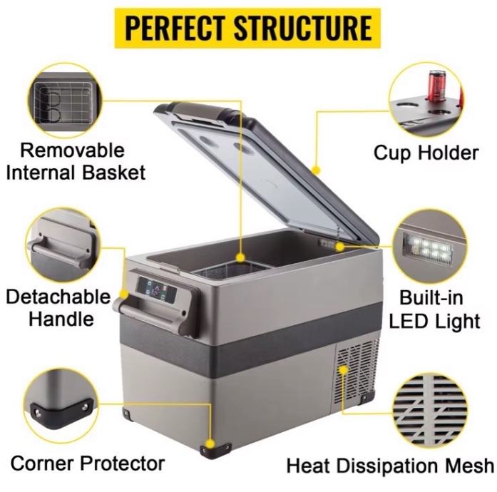 Digitalni zaslon može prilagoditi temperaturu; ugrađeno LED svjetlo omogućuje bolje promatranje unutrašnjosti; uklonjiva unutarnja košara odvaja hranu; ugrađena ručka je prikladna za pomicanje; držači za čaše mogu stabilnije držati piće u automobilu. Štoviše, možete koristiti mobilnu aplikaciju za upravljanje hladnjakom.