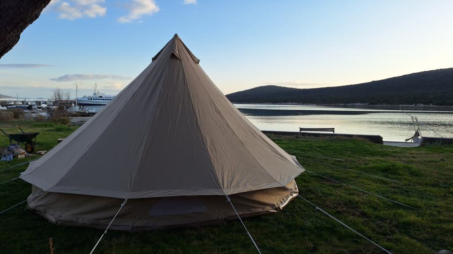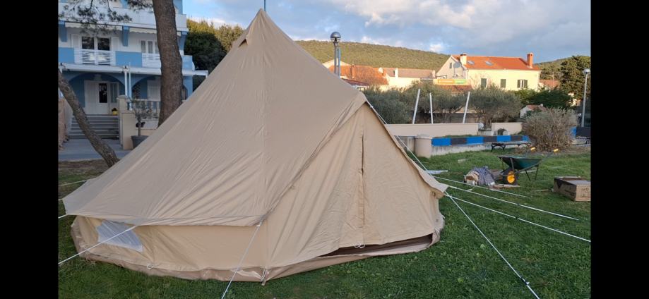 Prodaje se potpuno nov, (samo jednom probno instaliran na par sati) CanvasCamp Sibley bell ultimate 500 šator kupljen prošle godine direktno naručen iz CanvasCamp firme u Belgiji. Šator je promjera 5m, visine 3m, težine 40kg. Za 4 do 8 ljudi od Tentex C32 320gr/m tkanine. Moguća instalacija pećice na drva.