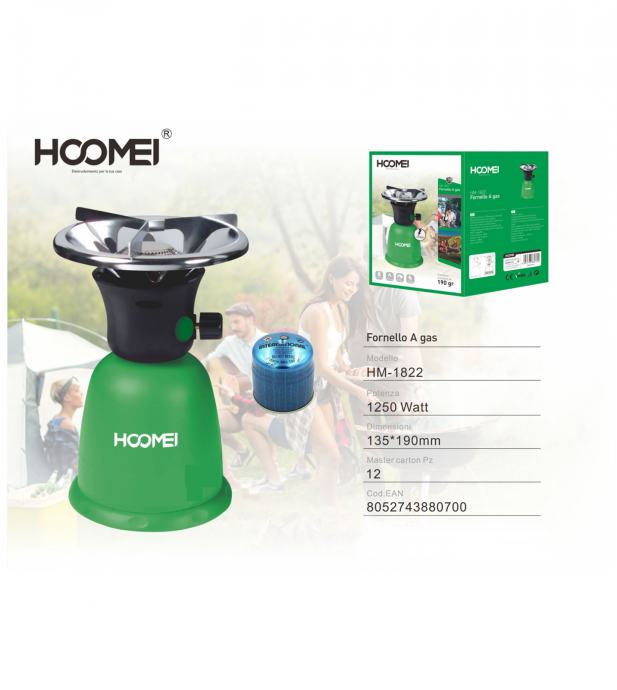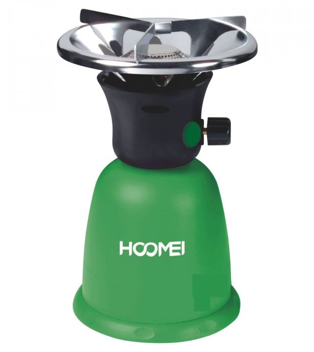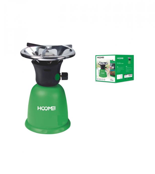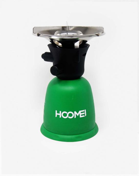 HOOMEI / DESTMAN kvalitetno kamping plinsko kuhalo DT-1822S na butan kartušu 190 g. s piezo upaljačem i zaštitom od vjetra. Stabilna plastična baza sa sigurnosnim držačem za kartušu i držačem za posudu od nehrđajućeg čelika s ugrađenom zaštitom od vjetra.