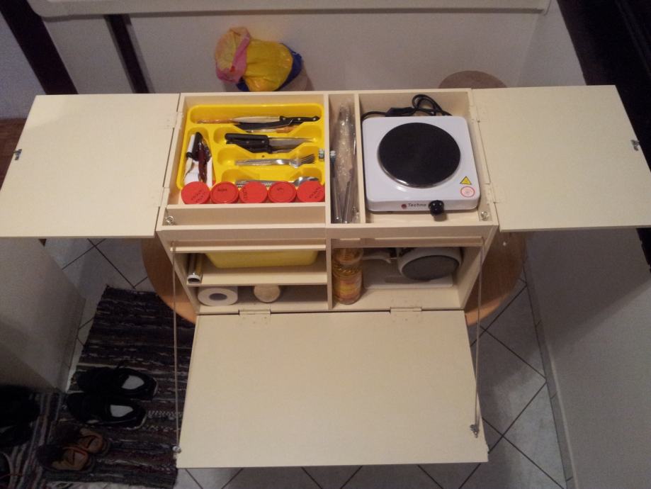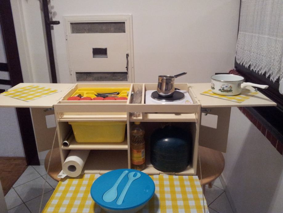 Prodajem kamp kuhinju.Dimenzije sastavljene kutije šir 70x vis 40x dub 40.Kuhinja prilagođenih dimenzija da stanu u svaki auto.Kutija multipraktik i ima dovoljno prostora za sve potrepštine za ugodan izlet u prirodi ili kampiranje na moru.Slika pribora simbolična ali postoji mogućnost prodaje po dogovoru.