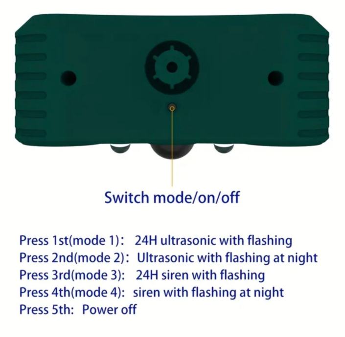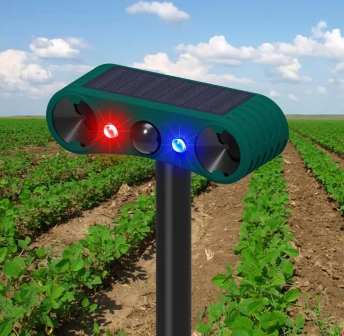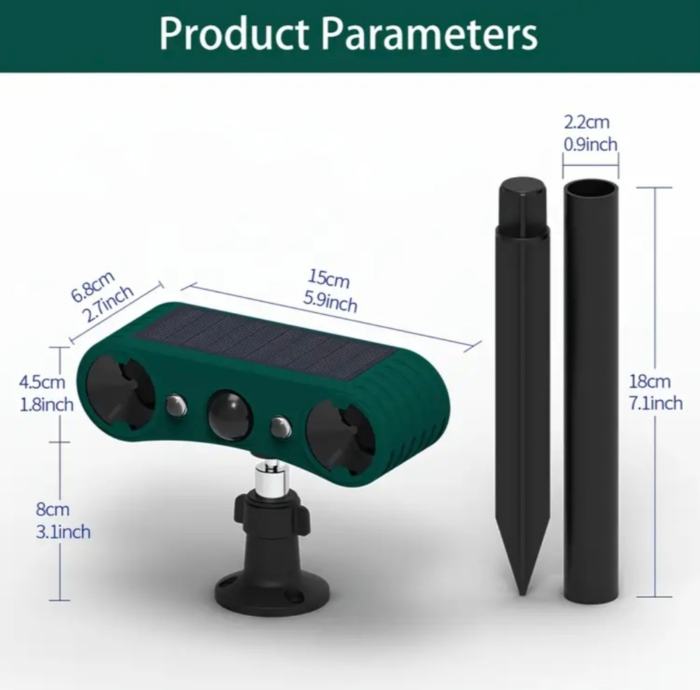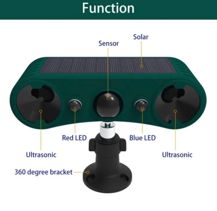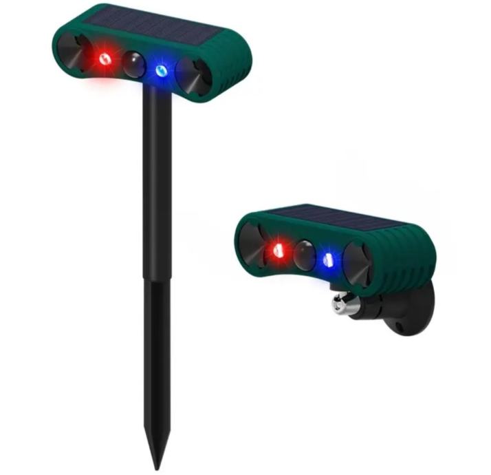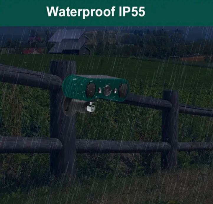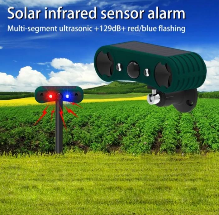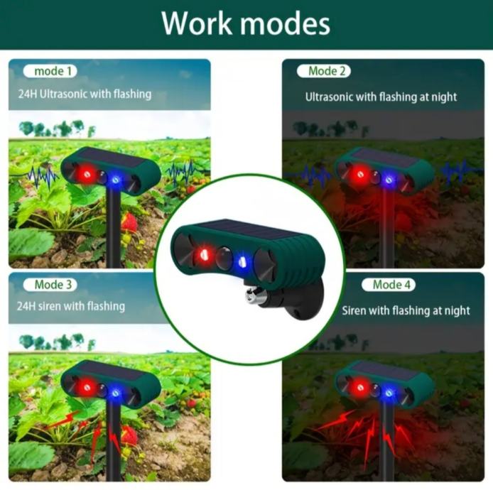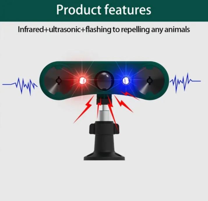 Ovaj inovativni uređaj koristi kombinaciju infracrvenog senzora, snažnog ultrazvuka i bljeskajućih LED svjetala (crveno i plavo) kako bi efikasno odbio bilo kakve uljeze – bilo da se radi o divljim životinjama ili ljudima.