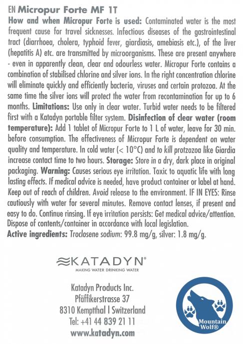 Katadyn FORTE uklanja sve štetne mikroorganizme (bakterije, viruse, protozoa parazitske mikroorganizme, ...) koji su u vodi te održava vodu pitkom do 6 mjeseci. Ako je voda mutna koristiti u kombinaciji sa filtrom vode.