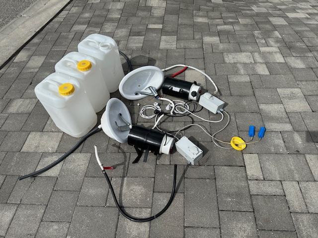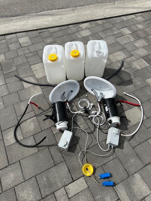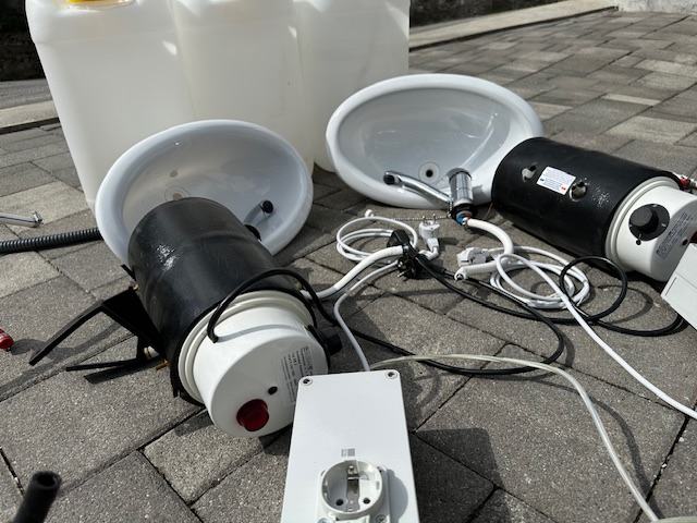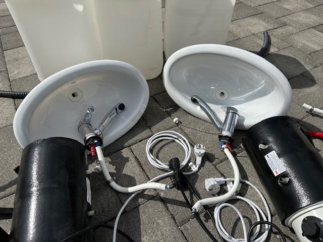 Prodajem komplet koji uključuje dva montažna plastična umivaonika s pripadajućim slavinama/mješalicama te električnim bojlerima. Dotok vode je iz dva kanistera (po 25 litara), a odvod se skuplja u trećem kanisteru (25 litara).