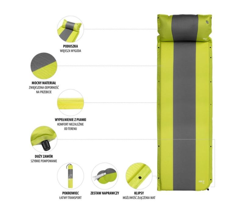 Kamperska podloga za spavanje se sama napuhuje. Jednostavno odvrnite ventil i pričekajte da se jastuk napuni do odgovarajuće razine, a zatim zatvorite ventil. Ispušite zrak otvaranjem ventila i smotavanjem jastuka. Spremite podlogu pomoću 2 remena i stavite ju u torbu.Ugrađeni jastukMaterijal: 75D poliester, PVC, PU visoke gustoće, plastični ventilDuljina: 193 cmŠirina: 58 cmDebljina: 3 cmSklopljena: 62 x 15 cmTežina proizvoda: 1,2 kgUključen set za popravakBoja: žuta