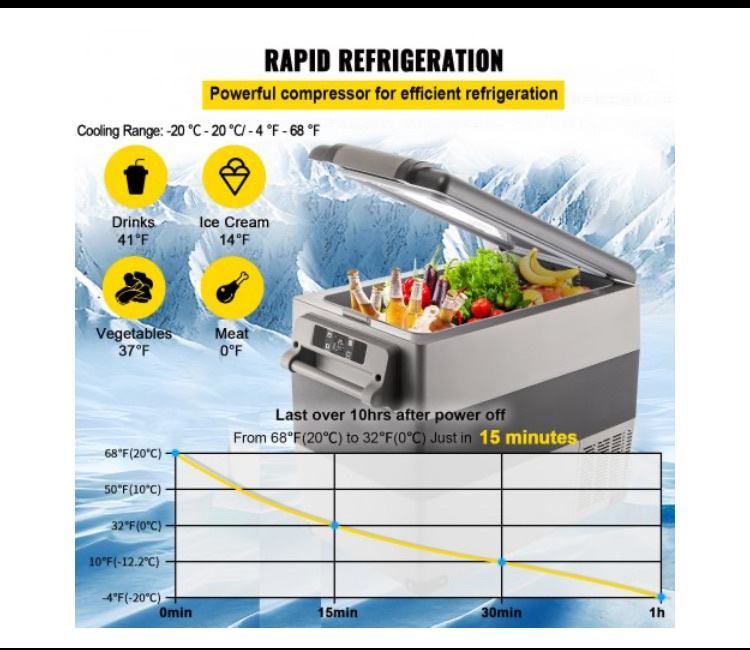 S tehnologijom hlađenja kompresorom, ovaj zamrzivač za automobile od 12 V može postići brzo hlađenje od -20 ℃ + 20 ℃ kako bi vaša hrana ostala svježa. Savršeno za putovanja, piknike, roštiljanje, kampiranje i zabave.