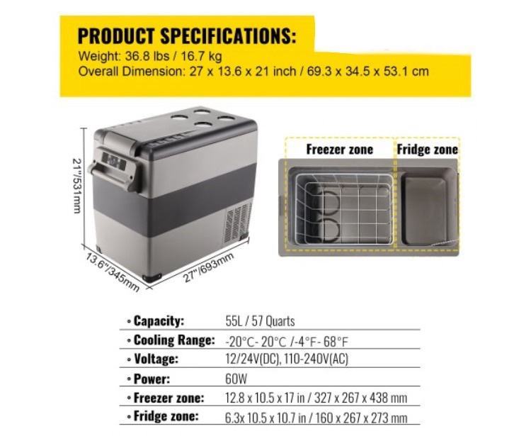 Ovaj prijenosni hladnjak kapaciteta 55L. je dovoljno velik za spremanje 60 limenki od 330 ml kole, 36 boca od 550 ml i 18 boca od 750 ml crnog vina. Naš hladnjak ima CE certifikat, u njemu možete pohraniti mnoga pića, povrće, voće, plodove mora, meso, proizvode za njegu kože i majčino mlijeko.