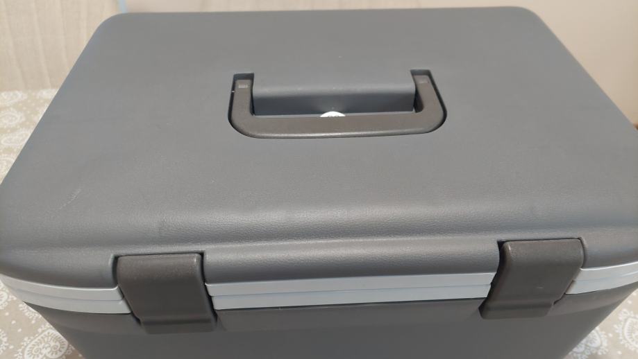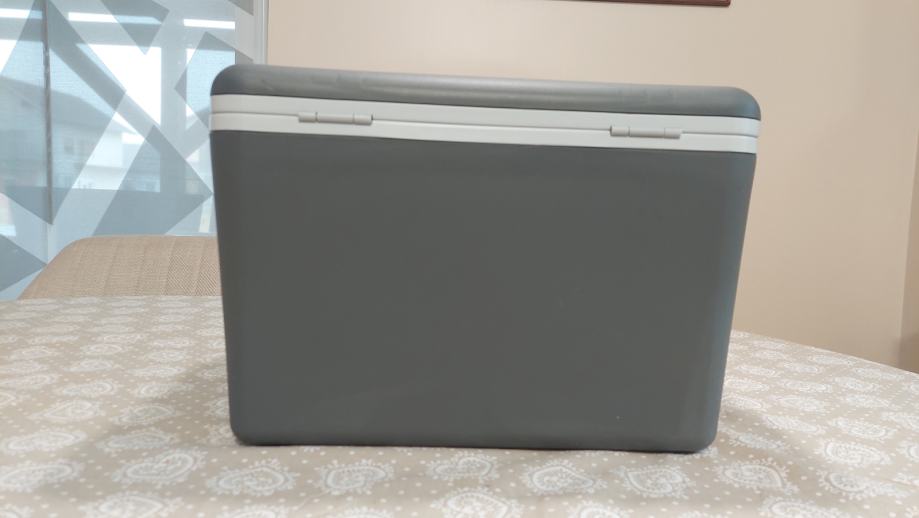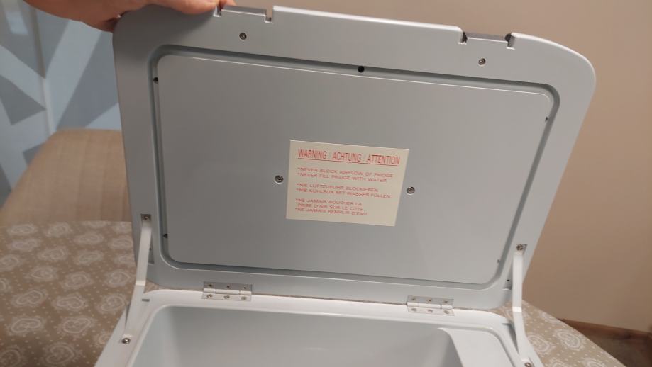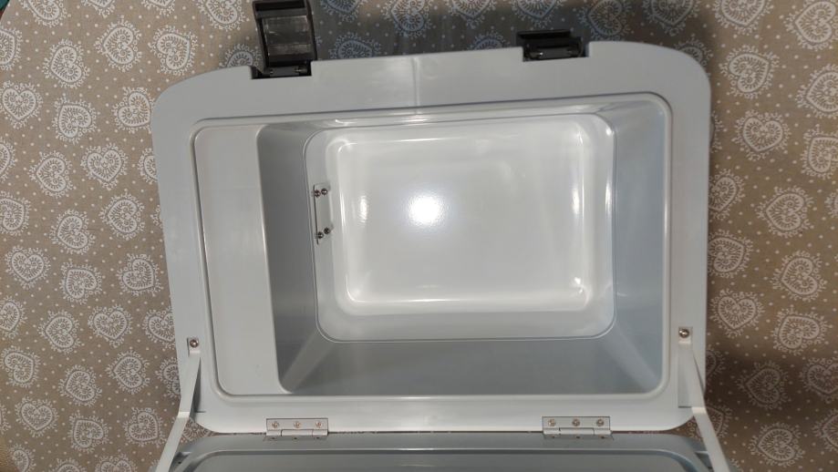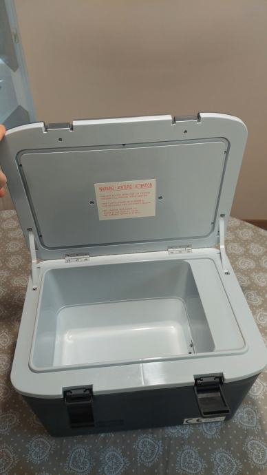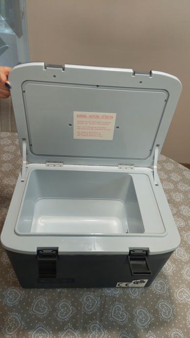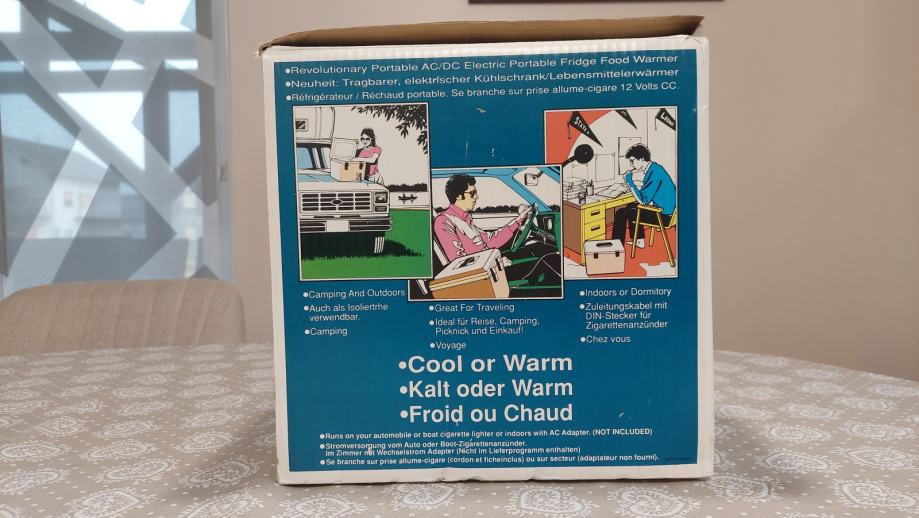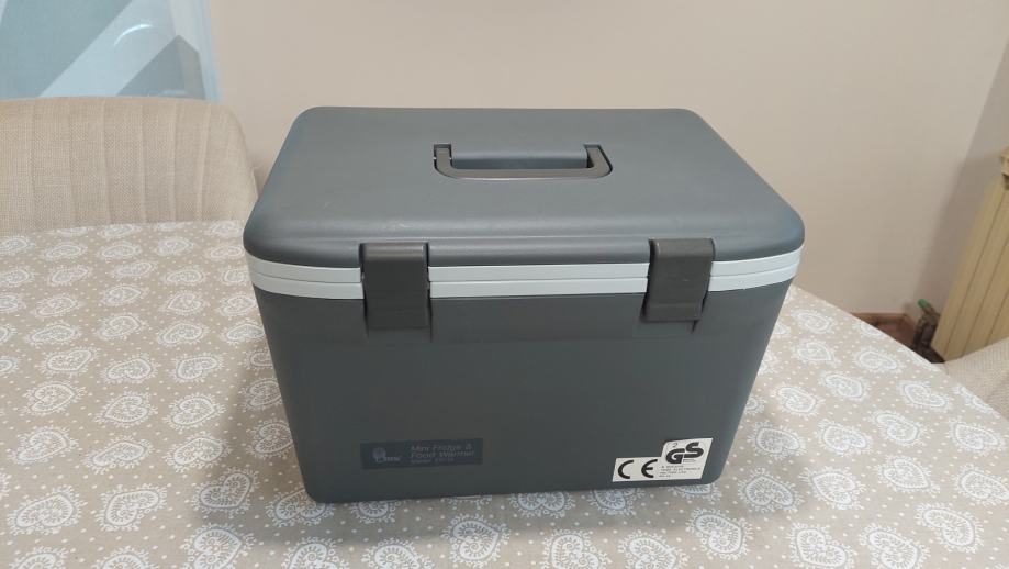 Prijenosni kamp frižider AMS FH-14, nekorišten, 12V. Novi, nikad upotrebljen. Hladi ili grije. Radi na 12V, priključak na auto utikač .