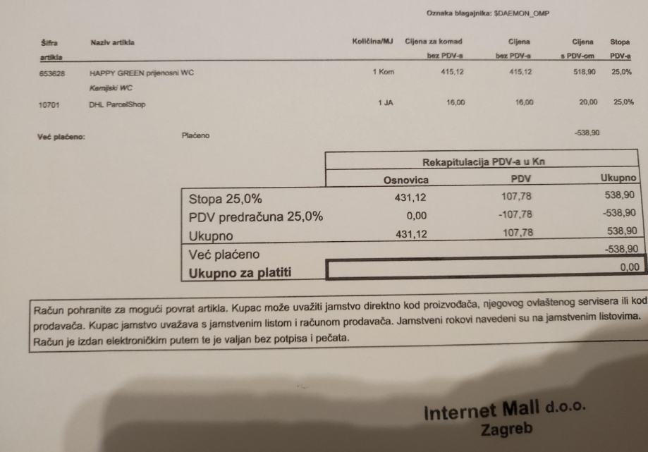 Prodajem prijenosni toalet, nekorišten, zapakiran + dezinfekcijsko sredstvo. Poštarina dodatno. Isključivo prodaja.