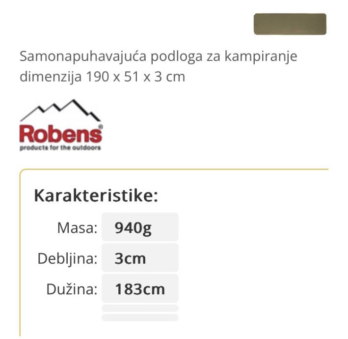 Podloga na samonapuhavanje Campground 30 koristi iskustvo brenda Robens, stečeno dugogodišnjom proizvodnjom vrhunskih outdoor proizvoda. U ovoj podlozi donosi visoku kvalitetu korištenih materijala, izdržljivost, moderan izgled, a sve po povoljnoj cijeni. Prihvatljiva težina je nešto što se podrazumijeva. Podloga je izrađena od vrlo izdržljivog 100% poliestera, koji je otporan na kidanje i habanje. U unutrašnjosti su okomito postavljene pjenaste jezgre, koje smanjuju težinu i veličinu pakiranja. Pakiranje uključuje i praktičnu transportnu torbu