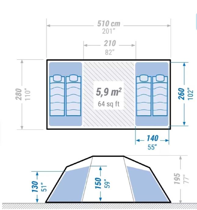 Šator kupljen prošle godine u Decathlonu, korišten jednom 7 dana, kao novi. 2 spavaonice za 2 osobe i boravak, koji isto može biti spavaonica pa stane i 6 osoba.