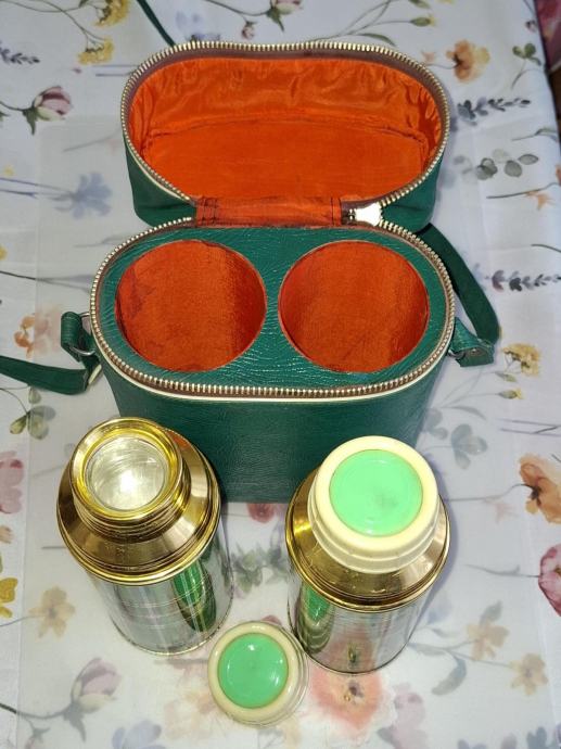 Dvije manje metalne termosice s praktičnom futrolom za nošenje.
