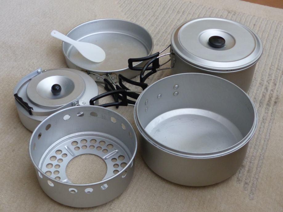 Set za kuhanje u kampu/ na planinarenju/ na jedrenju... Sastoji se od 5 dijelova, svi se uklapaju u najveću posudu i spremaju u etui. Od laganog materijala. U odličnom stanju.