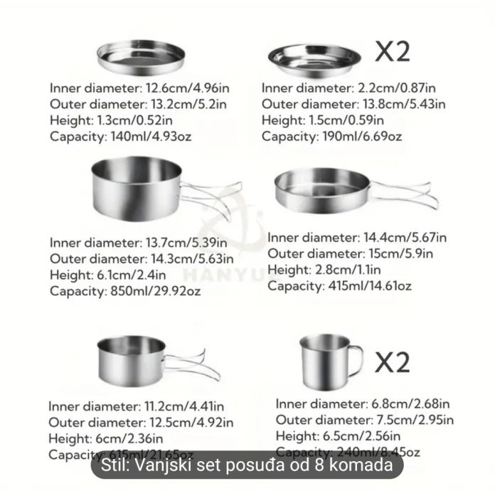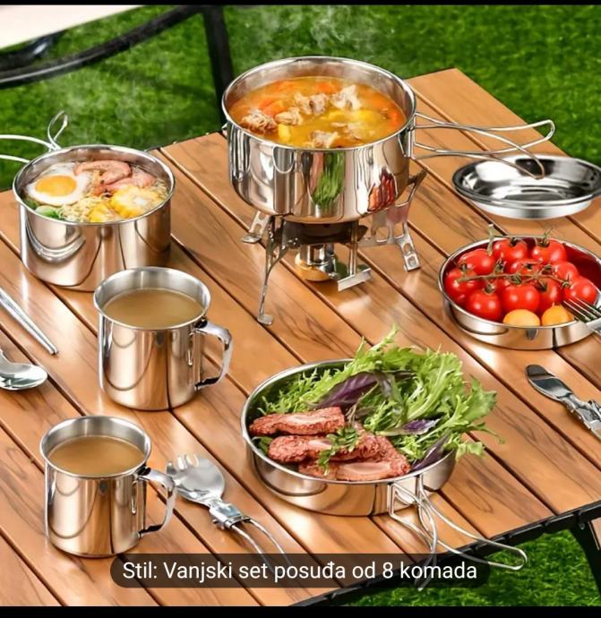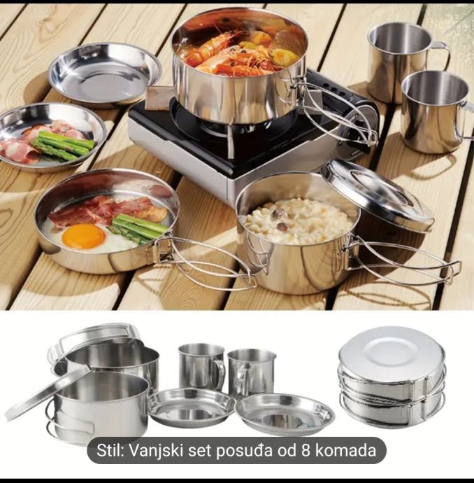 Novi, novo ne korišteno Set za kuhanje na otvorenom od nehrđajućeg čelika 8 dijelova, prenosivi komplet posuđa za kampiranje s loncima, univerzalno primjenjiva oprema za kuhanje na otvorenom za planinarenje, Dan zahvalnosti.