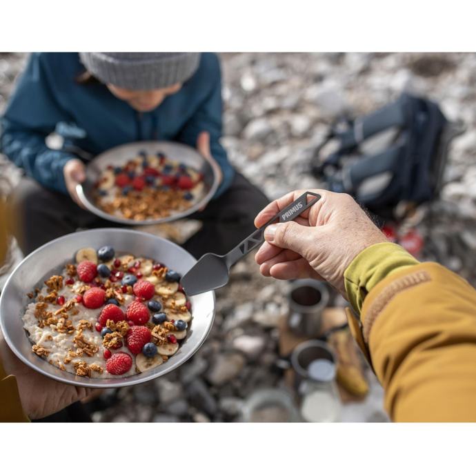 Komplet jedilnega pribora iz aluminija za vsak obrok med kampiranjem, na pohodu ali potovanju. V setu so žlica, vilica in nož. Usnjeno držalo poskrbi, da je komplet lično pospravljen.