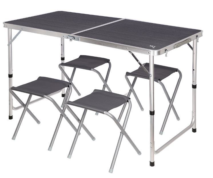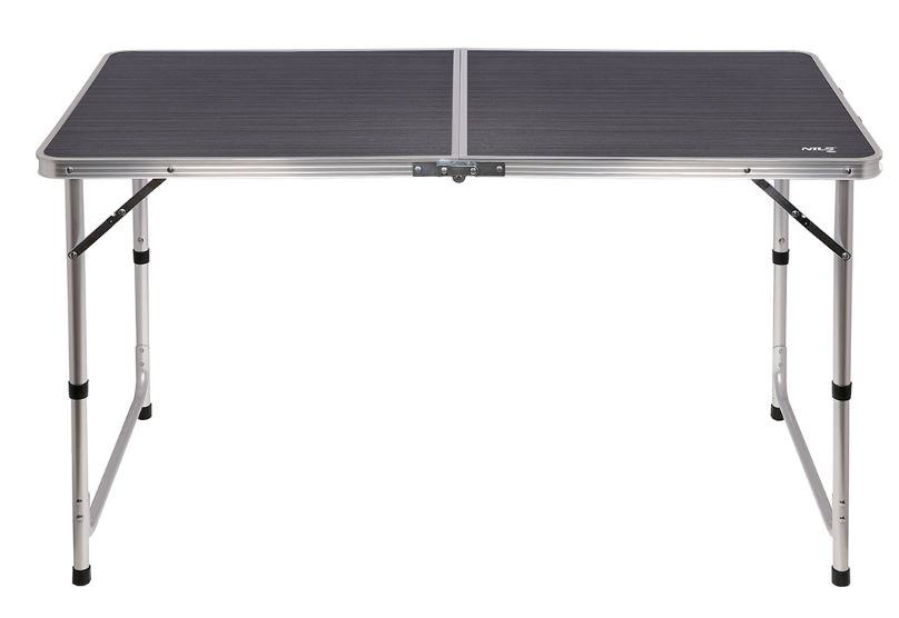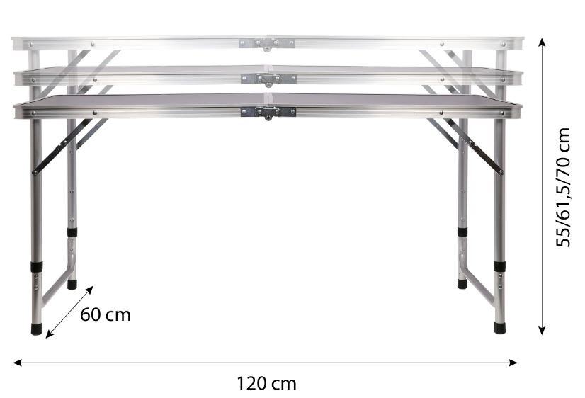 Sklopivi stol za kampiranje ili izlet i 3 različite visine pa je pogodan i za djecu. Čvrsta aluminijska konstrukcija i MDF ploča osiguravaju stabilnost i malu težinu samog proizvoda. Sklopi se poput kofera, a bočna ručka olakšava prenošenje proizvoda. Ima 4 sklopive stolice.Uključene su 4 stolice!Materijal: MDF, aluminijNosivost je 25 kgGornja boja: antracitTežina: 4,3 kgŠirina: 60 cmVisina: 55 - 61,5 - 70 cmDuljina: 120 cmRazmak nogu: 110 x 55 cmSklopljen: 60 x 60 x 6,5 cmUpotreba: kampiranje, izlet, piknik, vrt