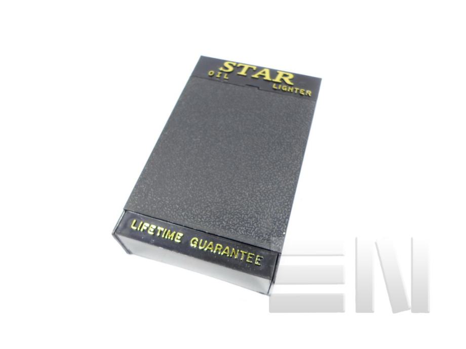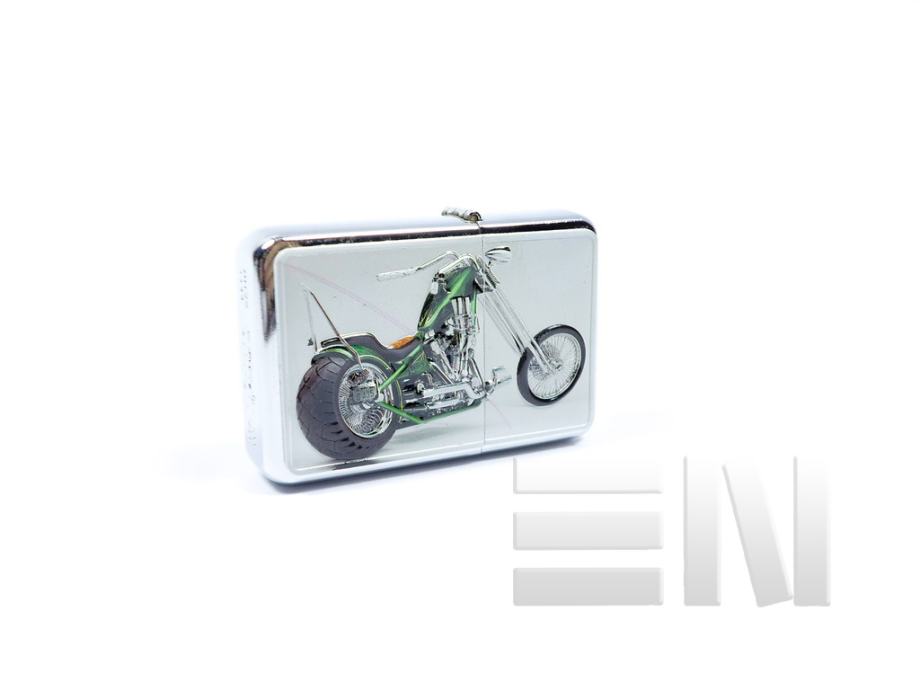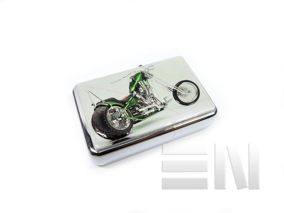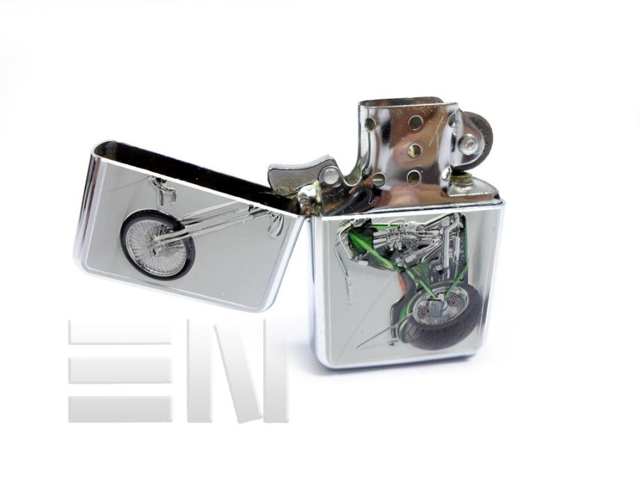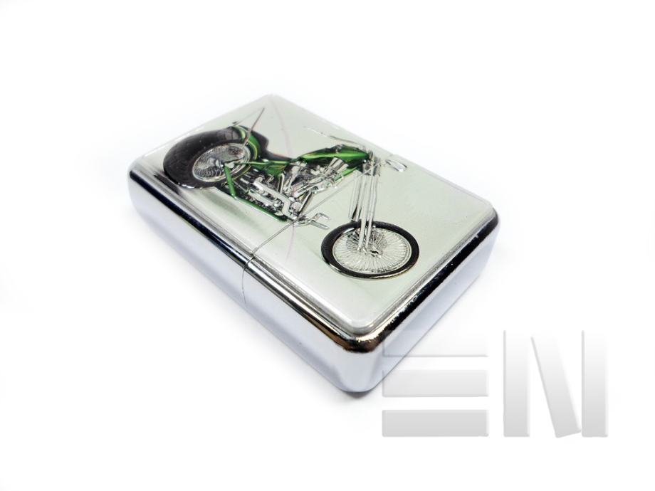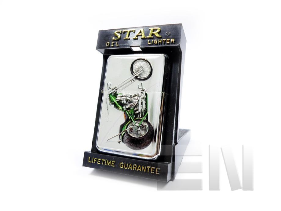 Upaljač na benzin marke Star sa 3D izbočenom slikom Choppera, druga strana upaljača polirani krom
