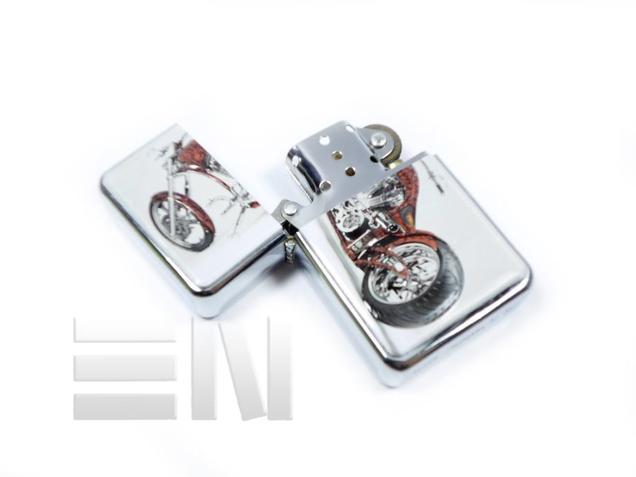 Upaljač na benzin marke Star sa 3D izbočenom slikom Choppera, druga strana upaljača polirani krom