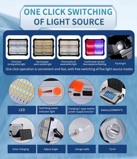 Višenamjenski Solarni punjivi prijenosni LED reflektor za kampiranje sa sklopivim solarnnim pločicama