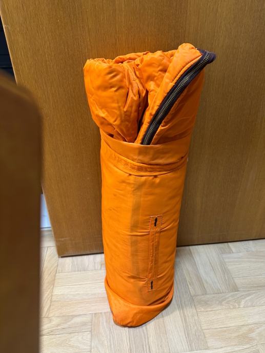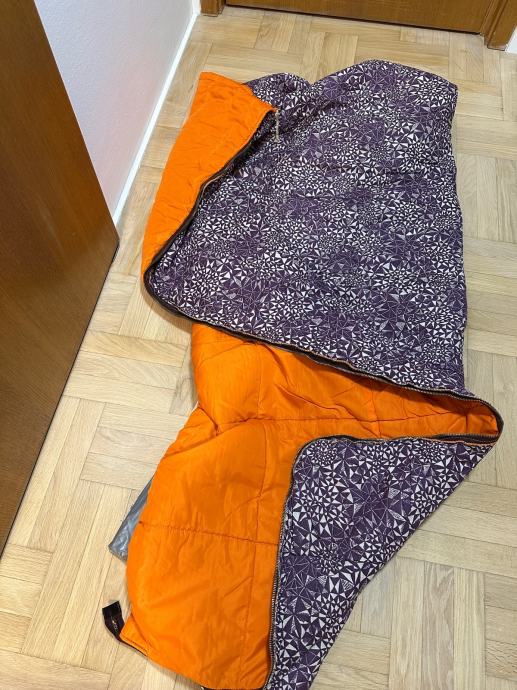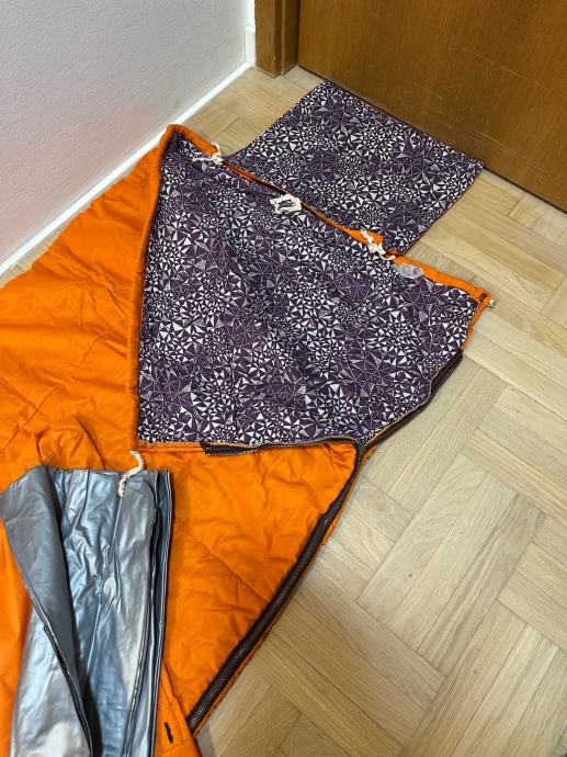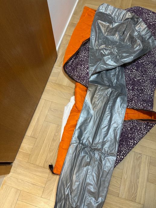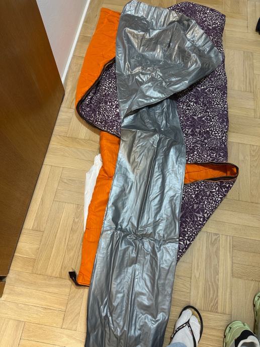 Planinarska vreca za spavanje, sastoji se od tri dijela, koristena. Vreča je prava planimarska, izvana šuskava nepropustan materija, iznutra panucni dio , onda još jedna pamucna zasebna vreča i ondra jos plastična navlaka za uvuci se , za sto bolju zastiti. Tako da se moze koristiti i zimi i ljeti a moze se raširiti koa prostirka i biti pokrivac.