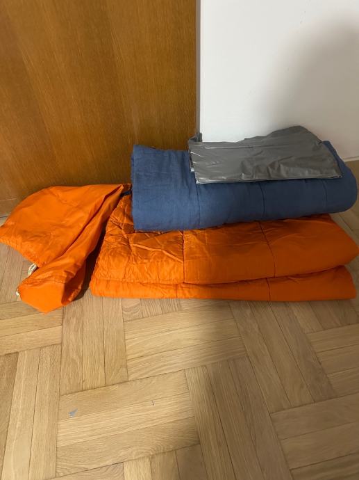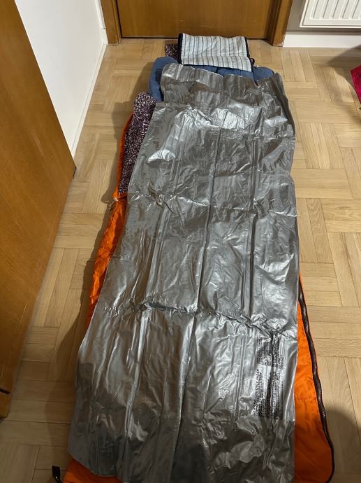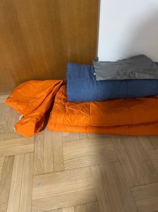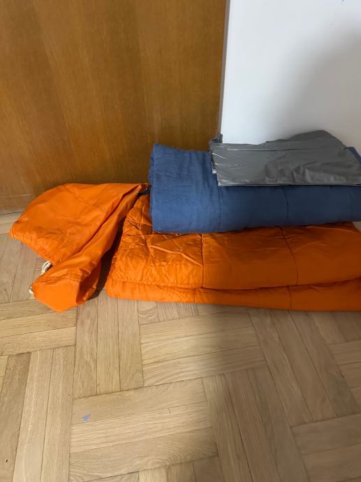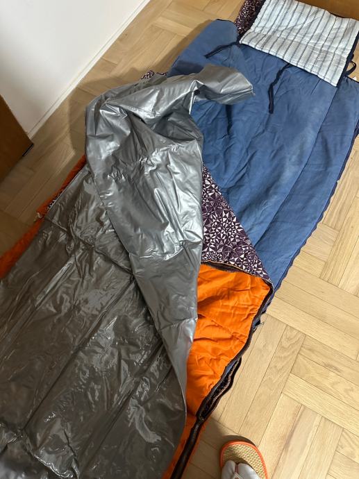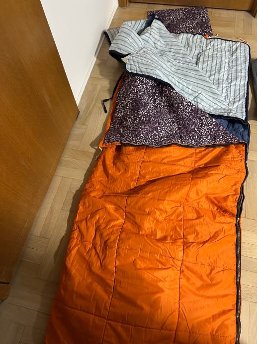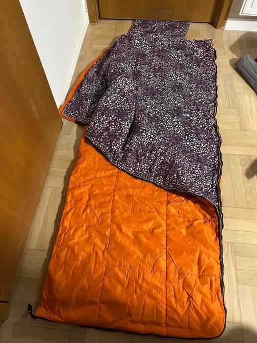 Planinarska vreca za spavanje, sastoji se od tri dijela, koristena. Vreča je prava planimarska, izvana šuskava nepropustan materija, iznutra panucni dio , onda još jedna pamucna zasebna vreča i ondra jos plastična navlaka za uvuci se , za sto bolju zastiti. Tako da se moze koristiti i zimi i ljeti a moze se raširiti koa prostirka i biti pokrivac.