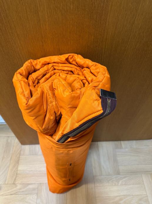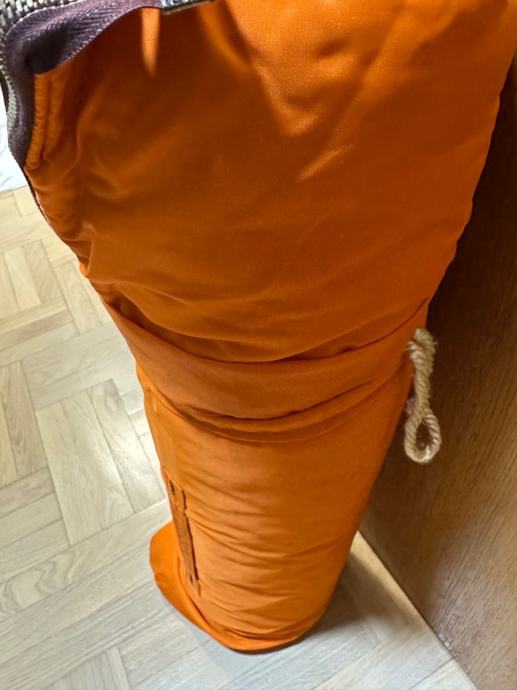 Planinarska vreca za spavanje, koristena. Vreča je prava planimarska, izvana šuskava nepropustan materija, iznutra panucni dio , ondra jos plastična navlaka za uvuci se , za sto bolju zastiti. Tako da se moze koristiti i zimi i ljeti a moze se raširiti koa prostirka i biti pokrivac.