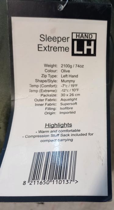 Vreću za spavanje Snugpak Sleeper Extreme, težine 2100 g, do -12 stupnjeva, s etiketama, nekorištenu, novu, prodajem za 50 eura + dostava paketomatom Boxnow.