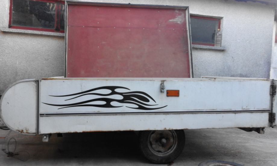 Prodajem Brako prikolicu bez tende. Nije registrirana ali posjedujem papire pa je moguca registracija. Moze se iskoristiti kao laka prikolica ako se skine gornji dio navedene. Potrebni su manji zahvati da se dovede u dobro stanje. Na navedenoj prikolici su gume od 10 cola ali se mogu staviti vecih dimezija. Prikolica ima torzijonu osovinu pa se ista moze iskoristiti samo za sebe.