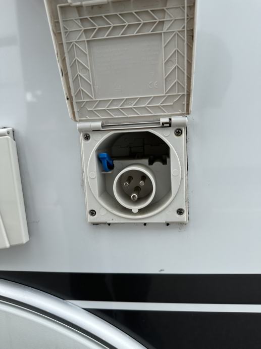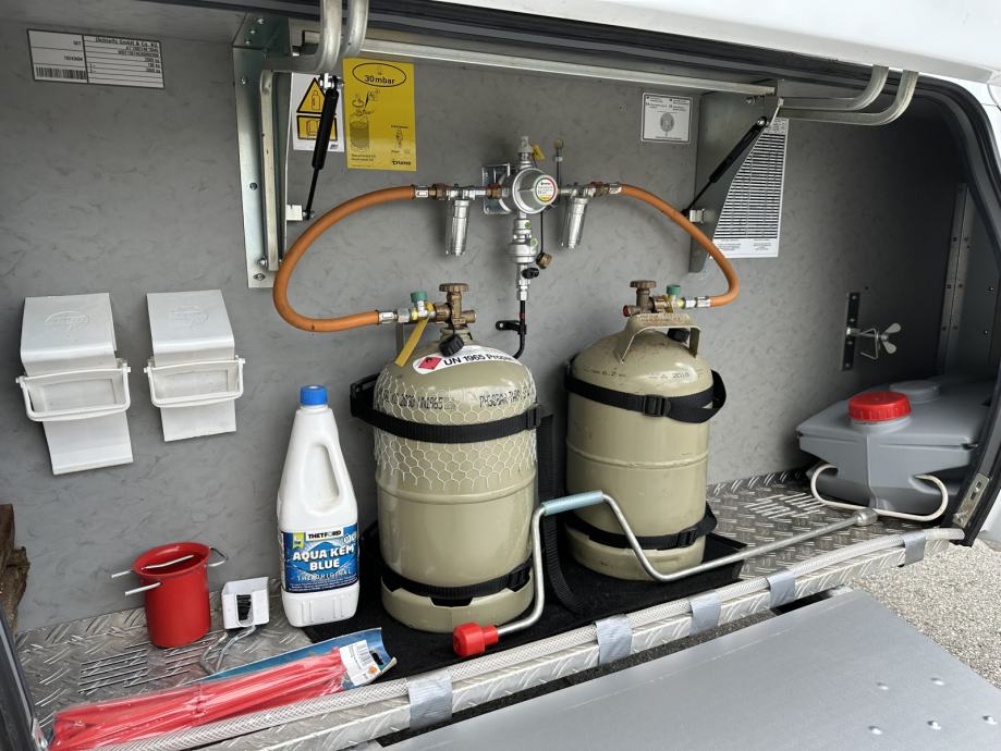 Prikolica posjeduje originalni montažni šator sa prihvatom na bočne vodilice prikolice dimenzija 8x3m. Šator je zatvoren sa svih strana te ga je moguće otvoriti u potpunosti ili kao prozore (prozirni djelovi folije). Šator je također kao novi i bez oštećenja (također i konstrukcija šatora) te se izrazito jednostavno postavlja. Prikolica ima industrijski monofazni priključak za napajanje same prikolice s vanjske strane ( kabel za spajanje na mrežu uključen), jednu izlaznu vanjsku utičnicu (220V), antenski ulaz (priključak), te priključak za vodu iz mreže kampa. S prednje strane se nalazi vanjski spremnik u kojem su integrirane dvije plinske boce za kuhalo te mjesto za pospremu raznog alata i ostalog.