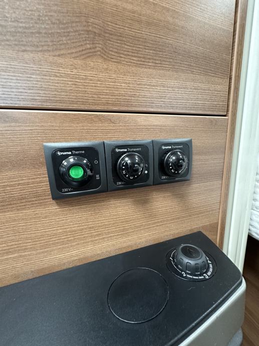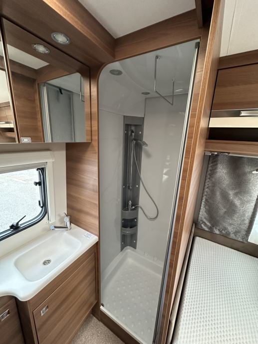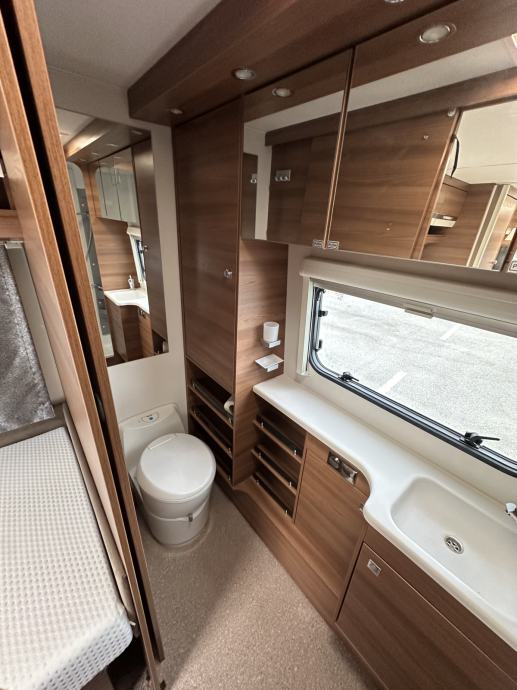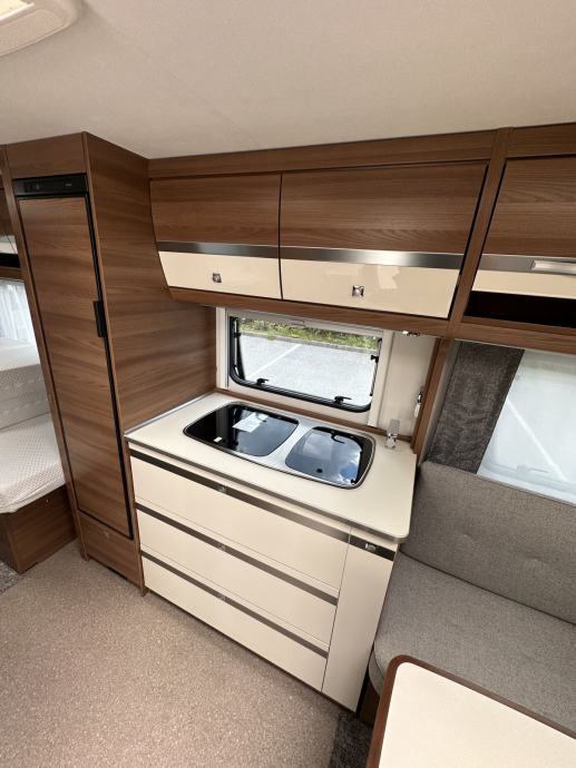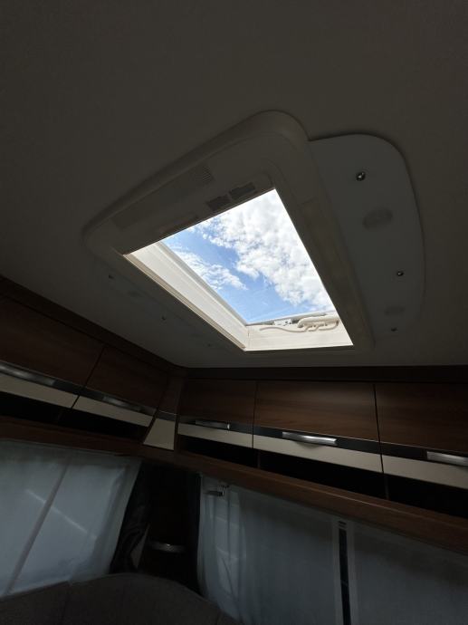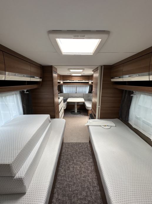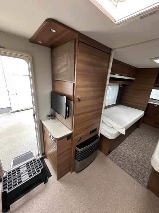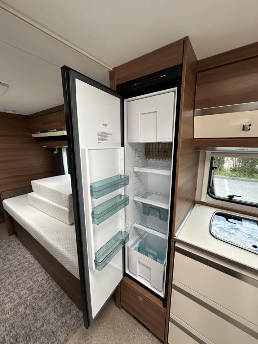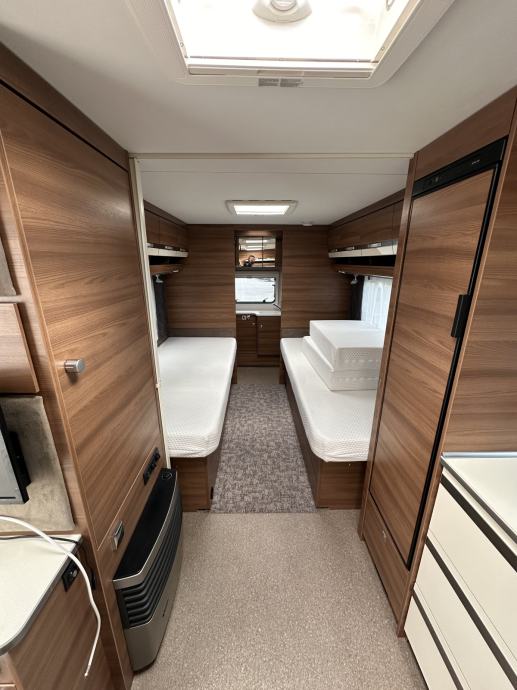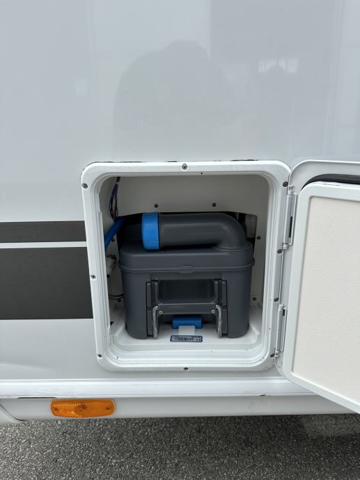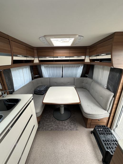Prikolica može smjestiti četiri osobe ( bračni krevet + dva klasična ležaja spojiva u još jedan bračni krevet). Prikolica je opremljena kuhinjom sa plinskim kuhalom (3 ringa), sudoperom ( voda iz plavog spremnika ili putem crijeva iz opskrbnog ormarića kampa), velikim hladnjakom sa ledenicom te mnoštvom ladica i mjesta za pohranu stvari. Prikolica ima integrirani sustav ventilacije i grijanja (električno grijanje). Kupaonica je opremljena sanitarnim čvorom sa integriranim crnim tankom (tank je na kotačima stoga pražnjenje do mjesta predviđenog u kampu se obavlja vrlo lako). Nadalje, kupaonica ima jedan umivaonik te tuš kabinu ( nikad korišteno ). Naknadno je u prikolicu ugrađen TV prijamnik. Krovni prozori imaju sjenila i komarnike, bočna stakla tvornički zatamnjena. Prikolica je u top stanju, bez tragova korištenja. Izrazito prostrana te luksuzno opremljena.