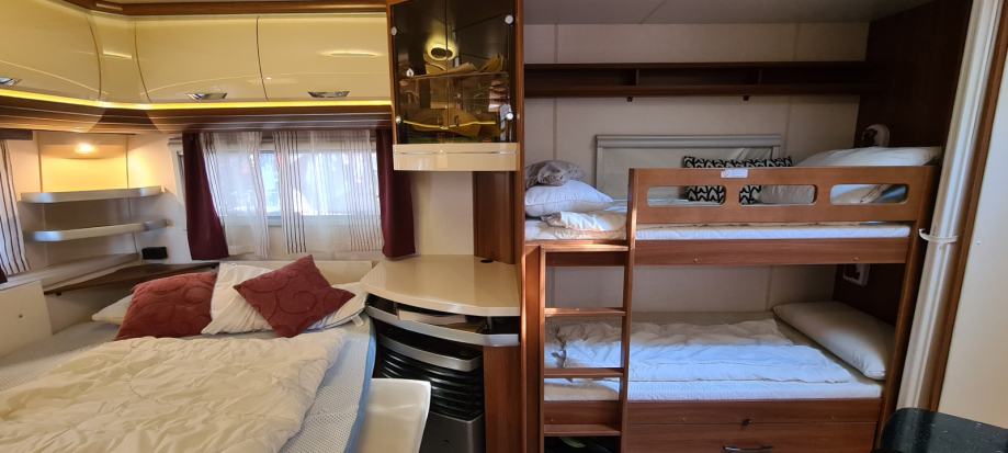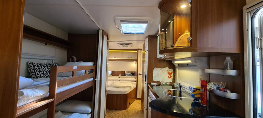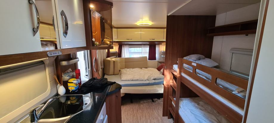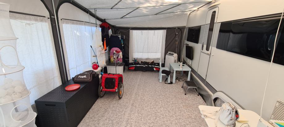 Prvi smo vlasnici prikolice, koja je korištena isključivo za osobne potrebe, sve godine na istoj lokaciji. Prikolica je korištena samo za spavanje, u njoj se nije bez kuhanja i sl., unutra izgleda kao nova. Prodaje se u kompletu sa šatorom i vanjskom kuhinjom sa elementima. Prikolica je vrhunska, sa ambientalnom LED rasvjetom, talnom grijanjem, klimo...