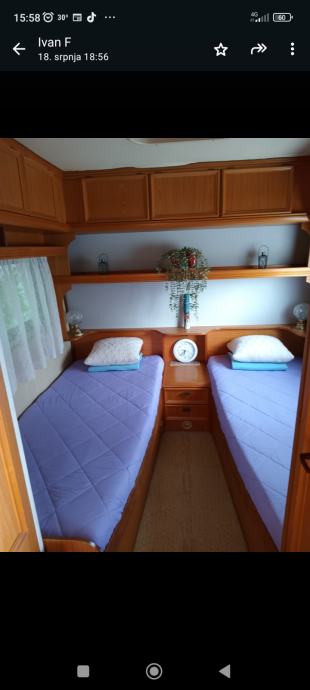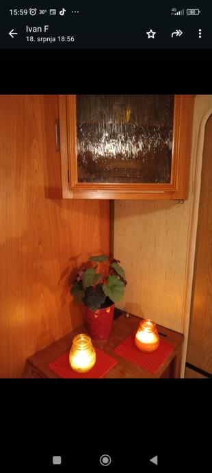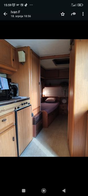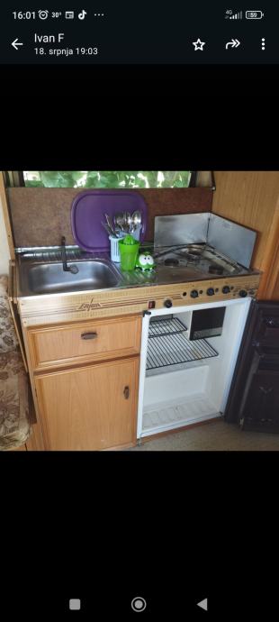 Kampica je opremljena i s kompletnim posuđem za jelo i kuhanje,dodatnom pecnicom,Kaffe aparatom i s još puno raznoraznih stvari(npr raznorazne police, solarne lampice,2ili 3 radia,aparat protiv insekata,kutija prve pomoći,rešo za kuhanje, sušilo za veš,fen,pegla itd itd stvarno je puna svega i svačega)