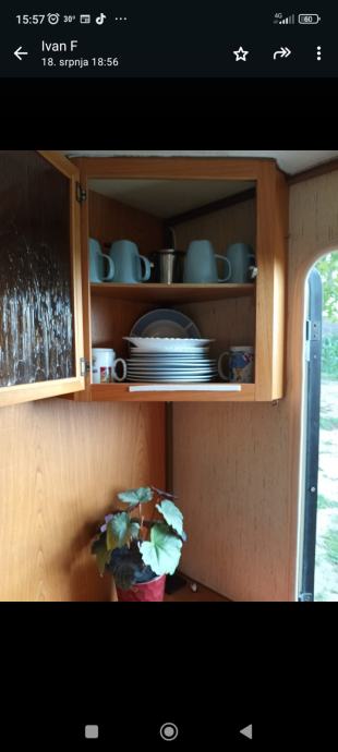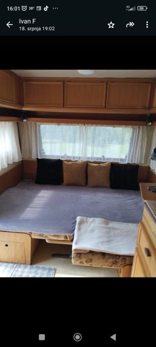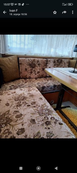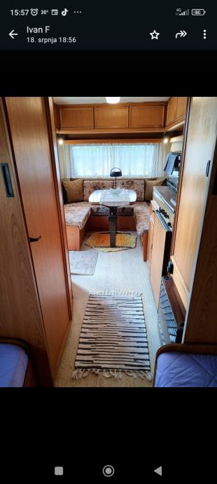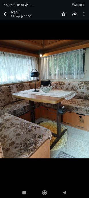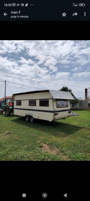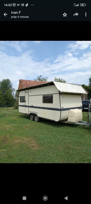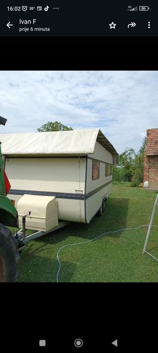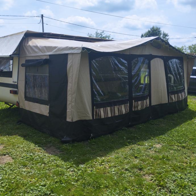 Kamp prikolica s aluminijskom konstrukcijom i ceradom ,koja dodatno štiti od kiše i sunca.