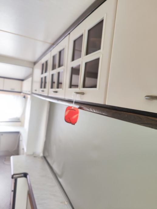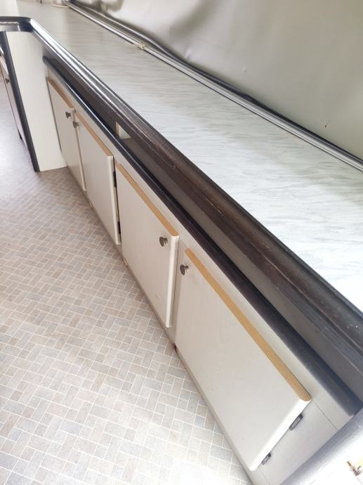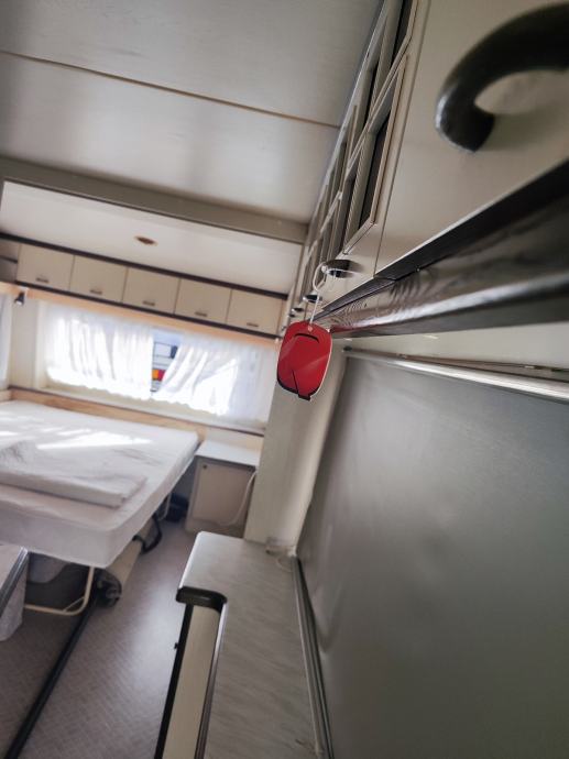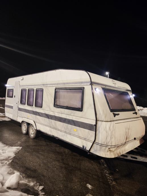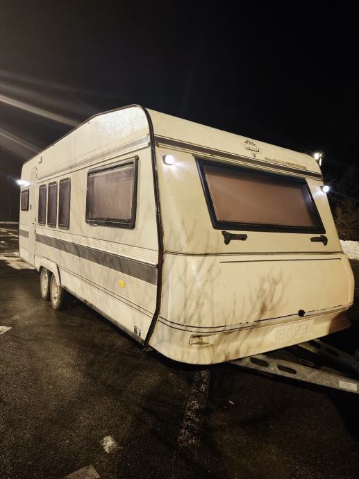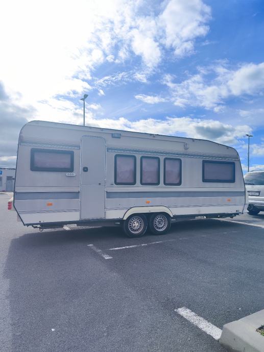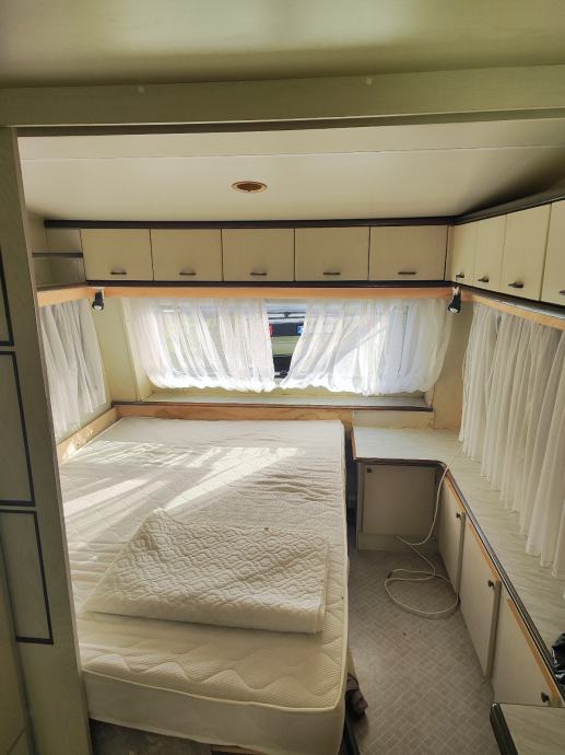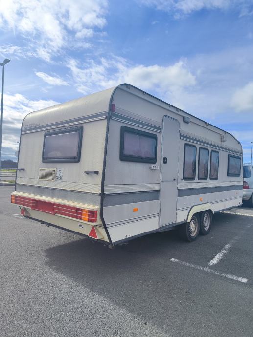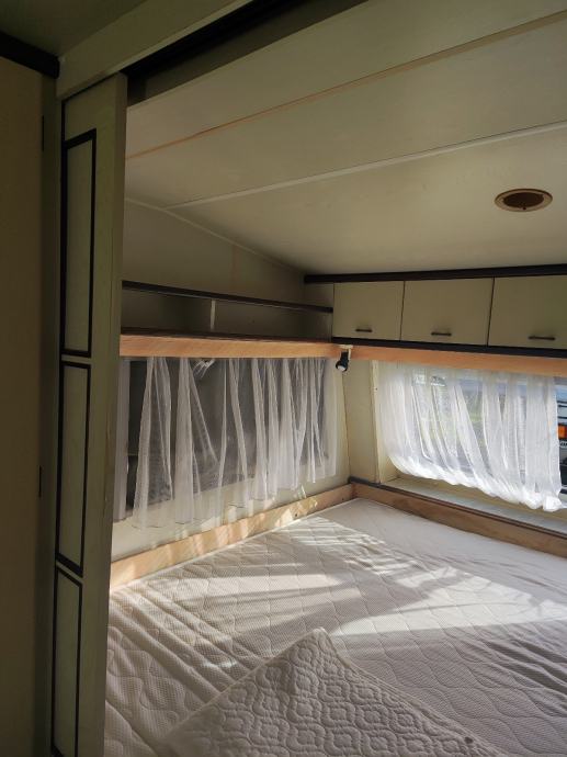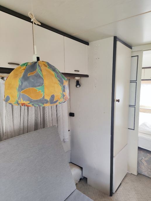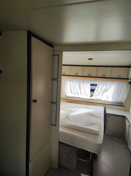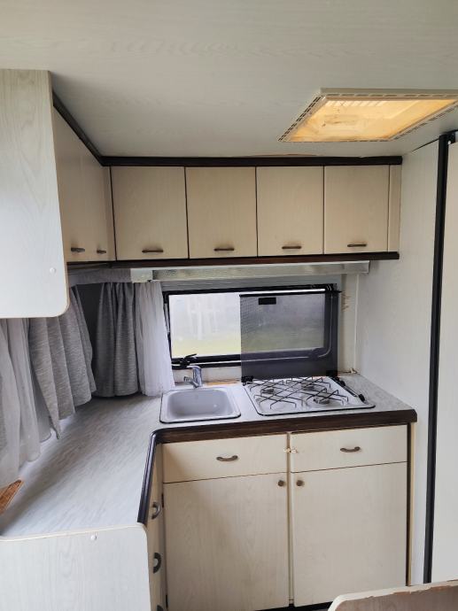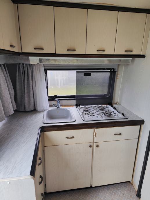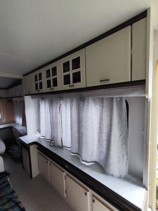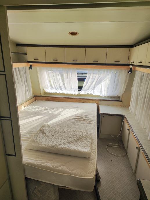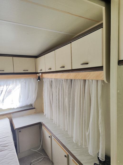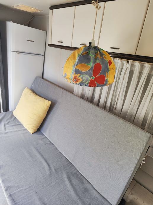 Kamp prikolica je u izvrsnom stanju.Unutra je ušcuvana jer nije godinama koristena..Stajala natkrivena.Prozori svi metalizirani i cijeli sa komarnicima i sjenila za sunce.Ima kuhinju sa friziderom (komb.plin-struja )i četiri ringa za kuhanje na plin.veliki bračni krevet sa novim kvalitetnim madracom.U sredini je jos jedan veliki krevet.U njoj je napravljena preinaka,zbog nekoristenja wc je izvadjen i u kut umetnut veliki novi frizider sa ledenicom.Tako da ima vise mjesta unutra.Ako neko želi moze se ponovno fixirat wc školjka sa odvodom na septicku.Prikolica je unutra uredna i prostrana sa lijepim svjetlim namjestajem..Naprijed u pretincu je plinska boca.Ima ugovor od prvog vlasnika.Nije za registraciju.Prikolica je odlicna za stacionirat na zemljište,parcelu u bilo koju svrhu.Cijena je snižena 20% do 1.8. Dostava besplatna do 50 km ,za dalje dogovor.Npr..Zadar 200€