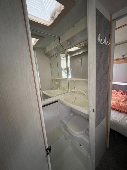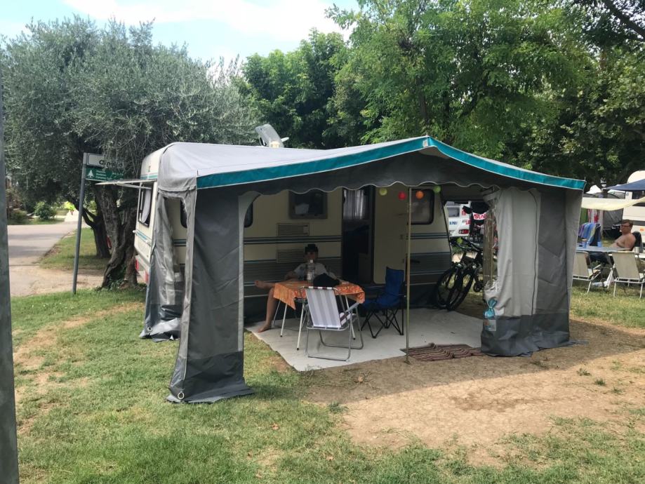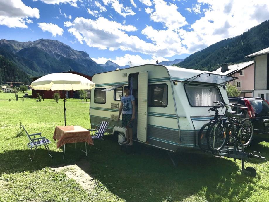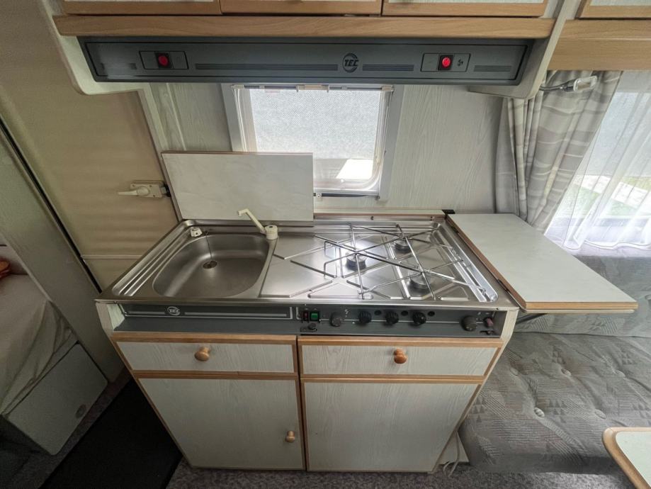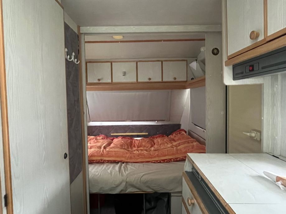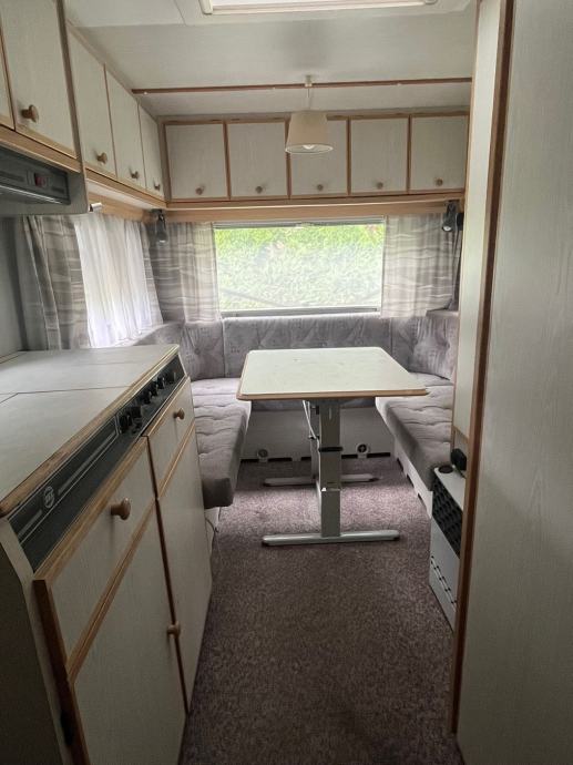 Kamp prikolica iz Švajcarske Duzina prikolice je 6m sa vucnom rudom bez rude 5,2m. U prednjem delu je spavaca soba sa velikim francuskim lezajem. Srednji deo je kuhinja sa plinskim sporetom sudoperom i friziderom. Kupatilo je sa kasetnom wc soljom prazni se spolja, umivaonikom i tus kadom. U zadnjem delu je velika garnitura za sedenje i tv koja se po potrebi pretvara u veliki lezaj. Prozori sa roletnama komarnicima i zavesama. Uz prikolicu ide i predsator, i nosač za bicikle