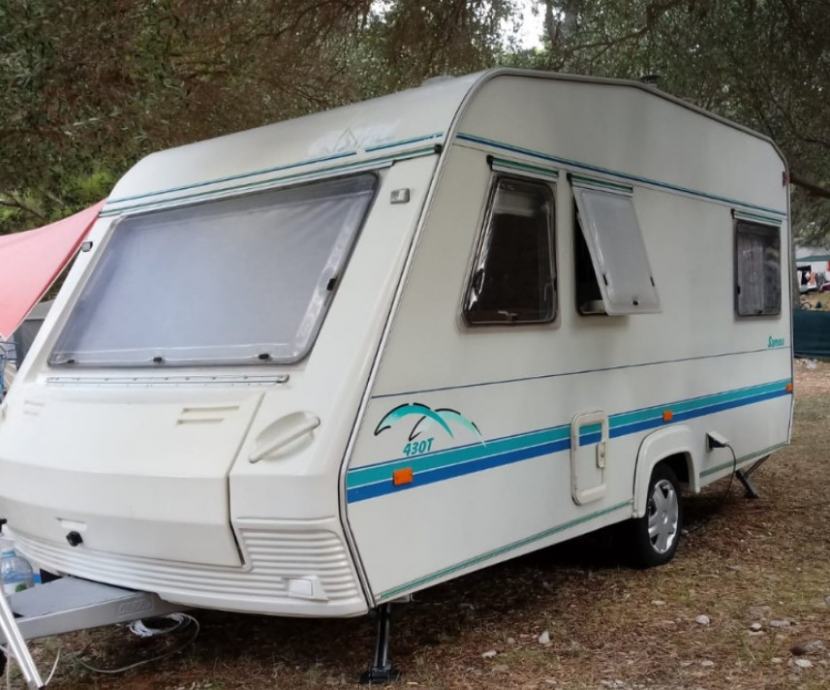 Ima komplet opremu: radi na 12V i 22oV , Al Ko ovjes, stabilizator za voznju,nove gume, sanitarni WC,frizider sa led komorom, kuhinja, kapacitet spavajucuh mijesta 5. Tenda...