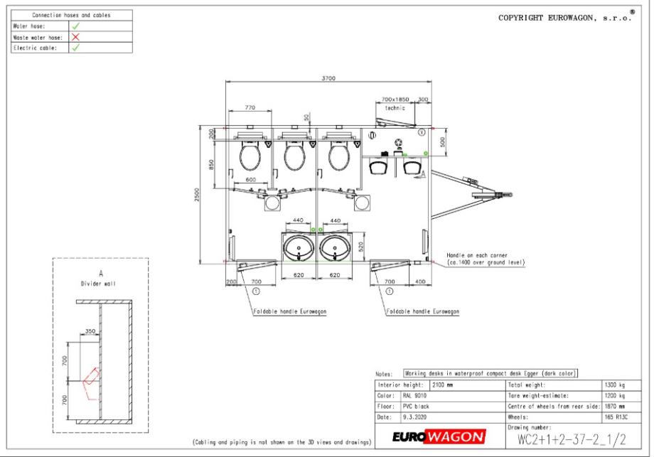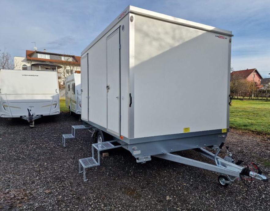 Dimenzija WC-a 3700mm dužina x 2500mm širina x 2190mm visina ; Ukupna dužina prikolice 5200mm x 2500mm širina x2920mm visina