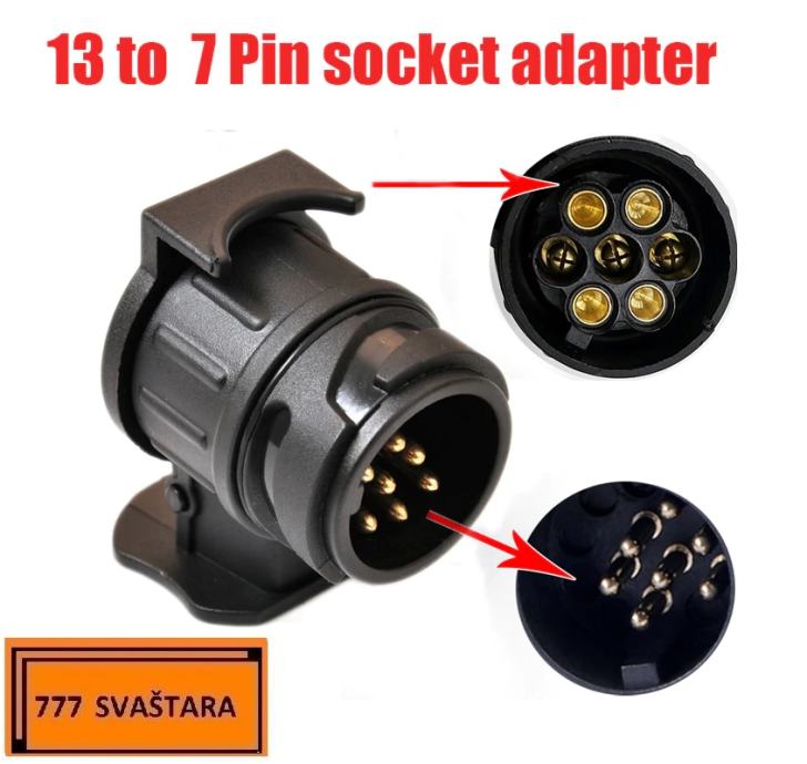 13-pinski muški na 7-pinski ženski adapter za prikolicu je standardna europska utičnica. Stvorite sigurnu vezu između vašeg glavnog vozila i dodatne prikolice. Prijenos elektroničkih signalnih svjetala s vozila na prikolicu.