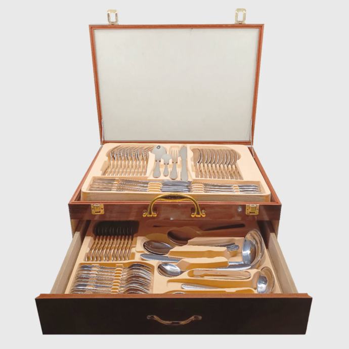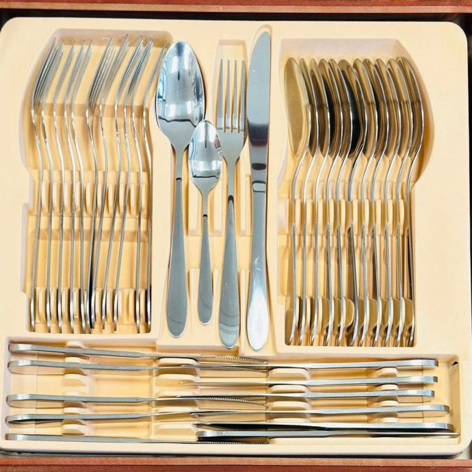 Izrađen od visokokvalitetnog nehrđajućeg čelika, ovaj set kombinira izdržljivost i eleganciju. Moderni dizajn i praktični kofer čine ga idealnim za organizaciju i transport. Dodajte sofisticiranost svojoj trpezi i uživajte u svakom obroku sa stilom.
