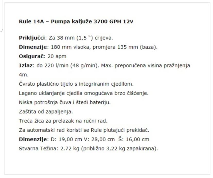Ispumpava 220 litara vode u 1 minuti (vidi tablicu)