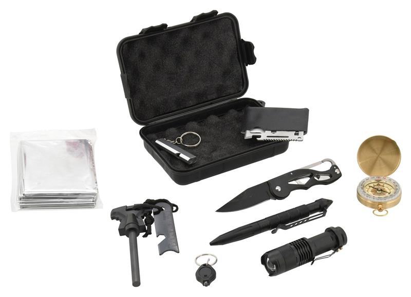 Može se čuvati i u vrećicama. Set uključuje: Zaštitnu kutiju Kompas sa vagom Dvostruka zviždaljka Višenamjenska kartica Nož za zaključavanje s osiguračem Dimenzionalna kremena Bivak folija Metalna olovka s vrhom za bušenje Privjesak s LED svjetlom LED ručna svjetiljka.