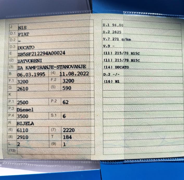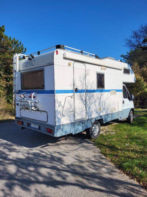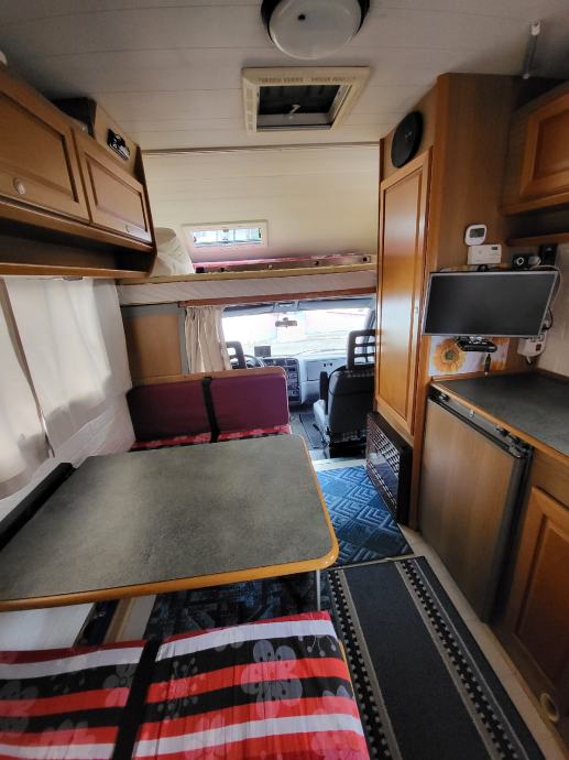 Fiat Ducato 25D, 1995 godište, 89000 km, registriran do 08/23, zračni ovjes, servis napravljen na 75000 km, nove gume, registriran za 6 osoba, mjesta za spavanje 6, plinski štednjak, frižider 12/220/plin, grijanje i 15lit. bojler na plin, mjesto za dvije plinske boce (1 ide sa kamperom), 2 x 80 lit. tank vode, 80 lit tank sive vode, wc kazeta, dvostruka gel baterija + 2x150 wati solarne ćelije, vanjski priključak 220 V + punjač baterija, sinusni inverter 1500 wata, led TV sa antenom i DVTB dekoderom, radio u kabini + radio u kamperu sa zvučnicima, nosač za 3 bicikle, parkirna kamera sa monitorom. Sve potpuno ispravno. Ništa osim nafte ne nedostaje da bi mogao odmah na put.