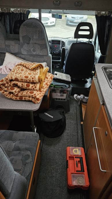 Uz navedeno, u kompletu s kamperom ide: kamperski stol s 2 stolca, nivelatori, strujni kabel s adapterom, rezervna pumpica za vodu, sklopiva sušilica za veš, kuhinjski pribor, izolacijska sjenila za stakla vozačke kabine.