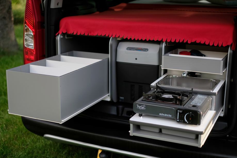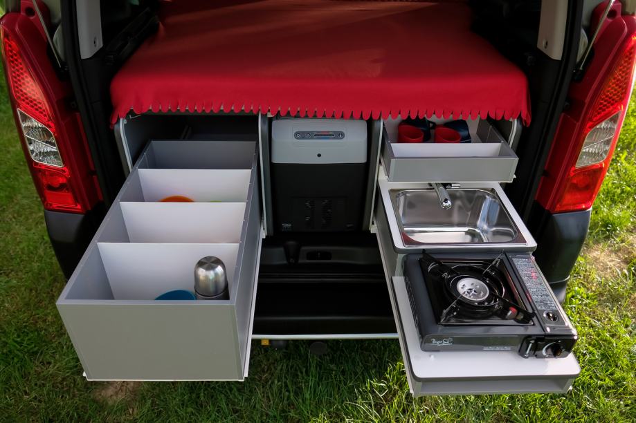 U stražnju stranu vozila postavlja se camping box iz kojeg se izvlači ležaj 200x140 cm, dovoljan za dvije odrasle osobe. Ugrađen je drugi akumulator koji se koristi za hladnjak. Autonomija je 24 sata i više.