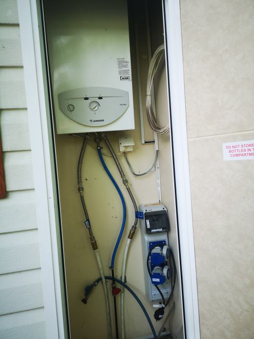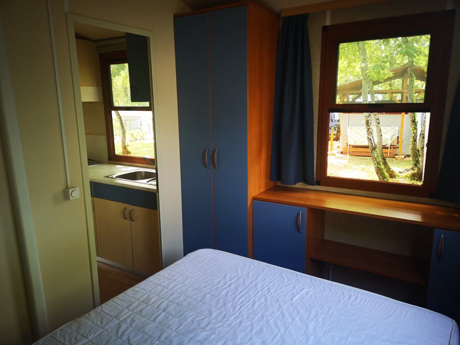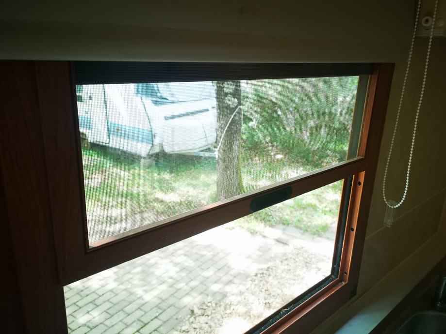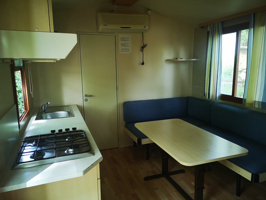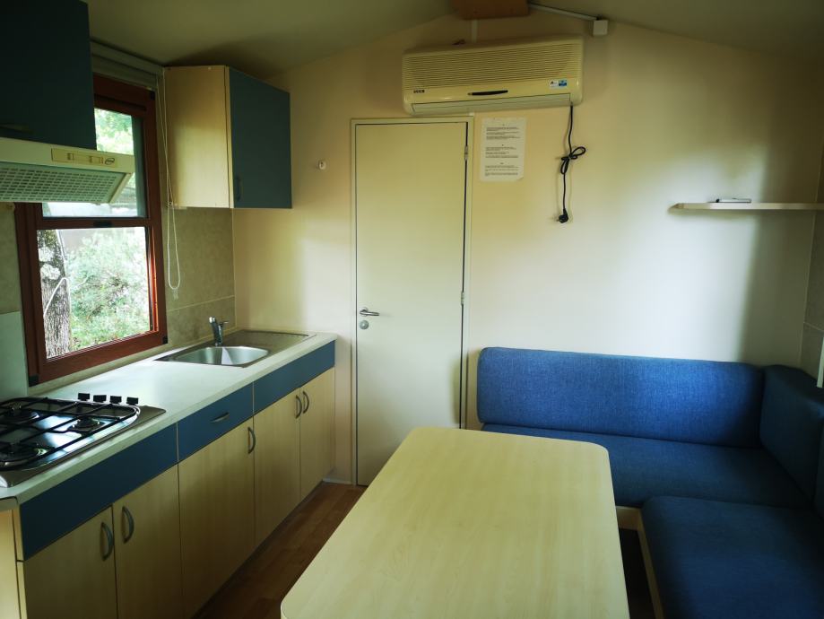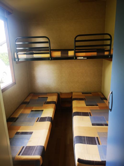 Mobilna kućica je opremljena: namještaj u spavaćim sobama, namještaj u kuhinji i kupaonici, klima uređaj, hladnjak, plinski bojler, plinski štednjak, komarnici. Sve radi normalno.